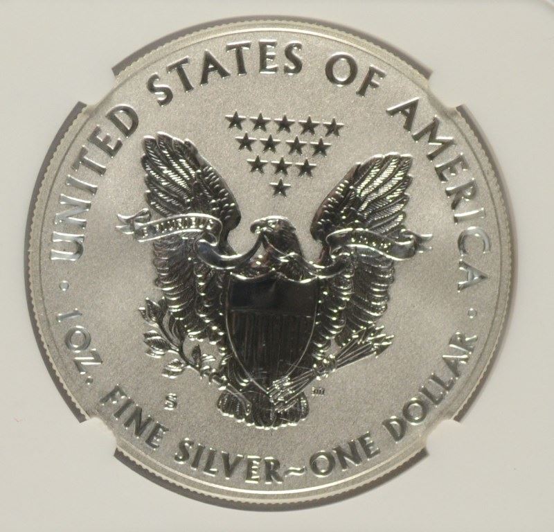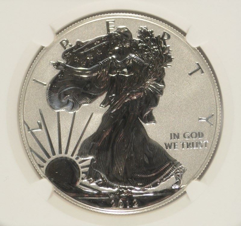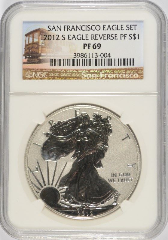 2012-S AMERICAN SILVER EAGLE, REVERSE PROOF, NGC PROOF-69 TROLLEY LABEL