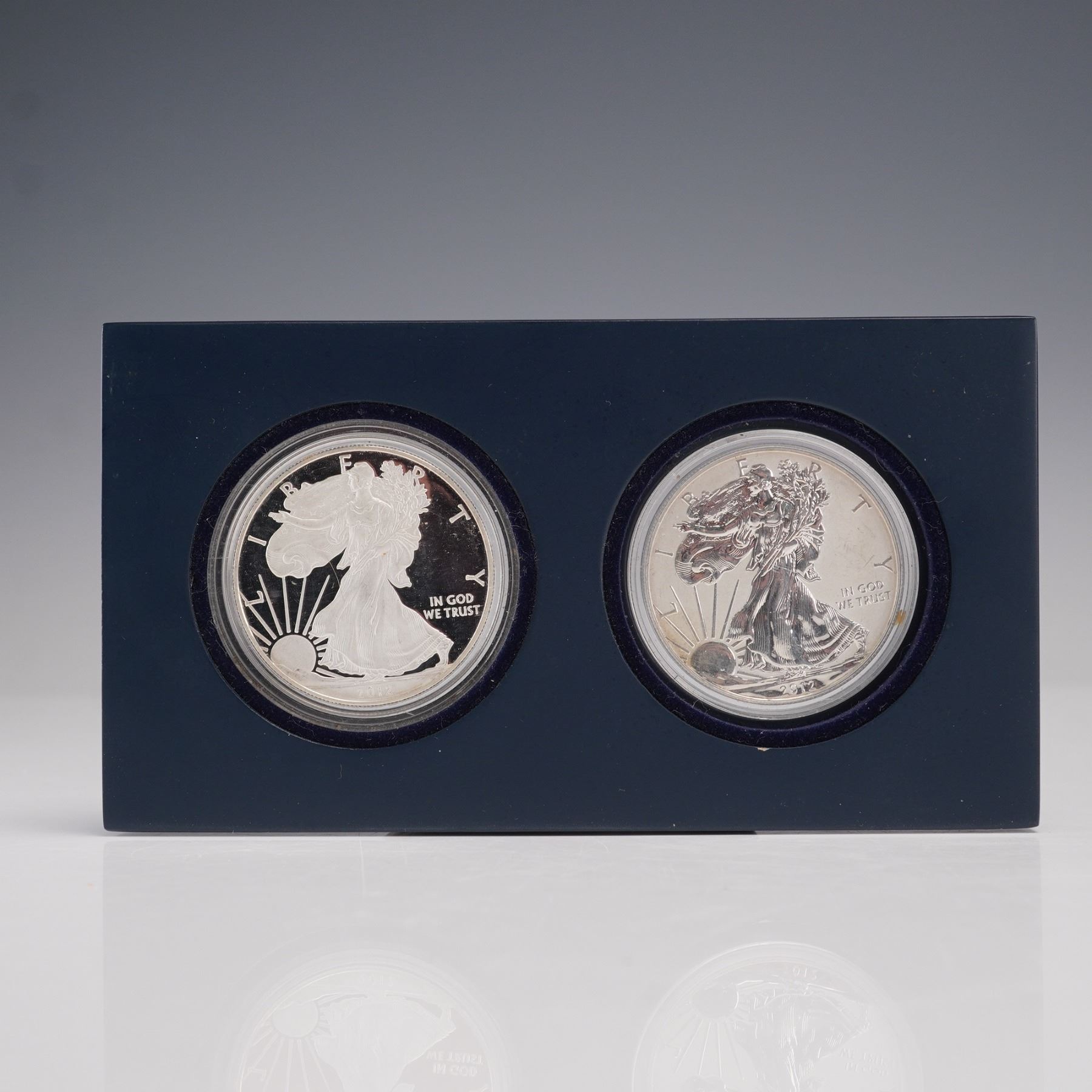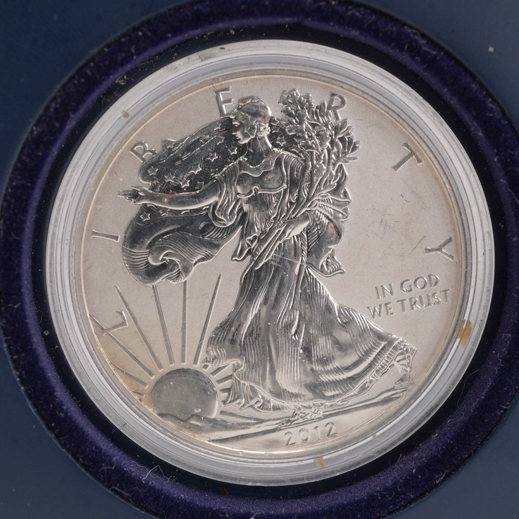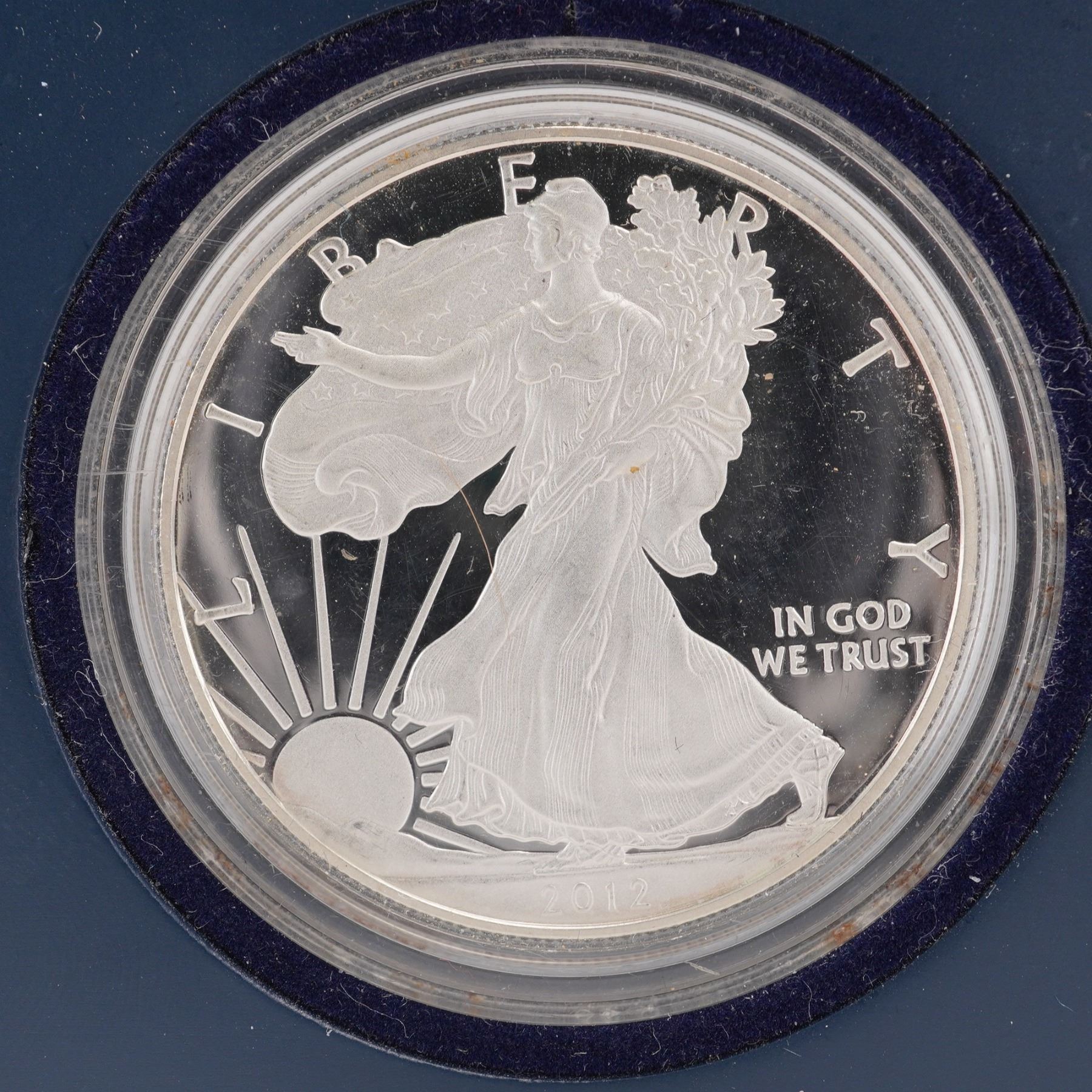 United States Mint 2012-S American Silver Eagle 2-Coin Set featuring one proof and one reverse proof coin. Each coin is struck in one troy ounce of .999 fine silver and bears the "S" mint mark indicating production at the San Francisco Mint. The obverse design on both coins depicts Adolph A. Weinman's historic Walking Liberty figure, originally used on the half-dollar from 1916 to 1947. Liberty is shown draped in the American flag, striding toward the sunrise, carrying branches of laurel and oak. Inscriptions include "LIBERTY," "IN GOD WE TRUST," and the year "2012." The reverse of each coin displays John Mercanti's heraldic eagle with shield design, featuring a bundle of arrows in the eagle's right talon and an olive branch in its left. A ribbon in the beak reads "E PLURIBUS UNUM," and a cluster of 13 stars represents the original colonies. The reverse also includes the inscriptions "UNITED STATES OF AMERICA," "1 OZ. FINE SILVER-ONE DOLLAR," and the "S" mint mark. Coins are presented in the original United States Mint clamshell-style display case with navy blue exterior and velvet-lined interior. Box: 6.75"L x 4"W x 1.75"H.