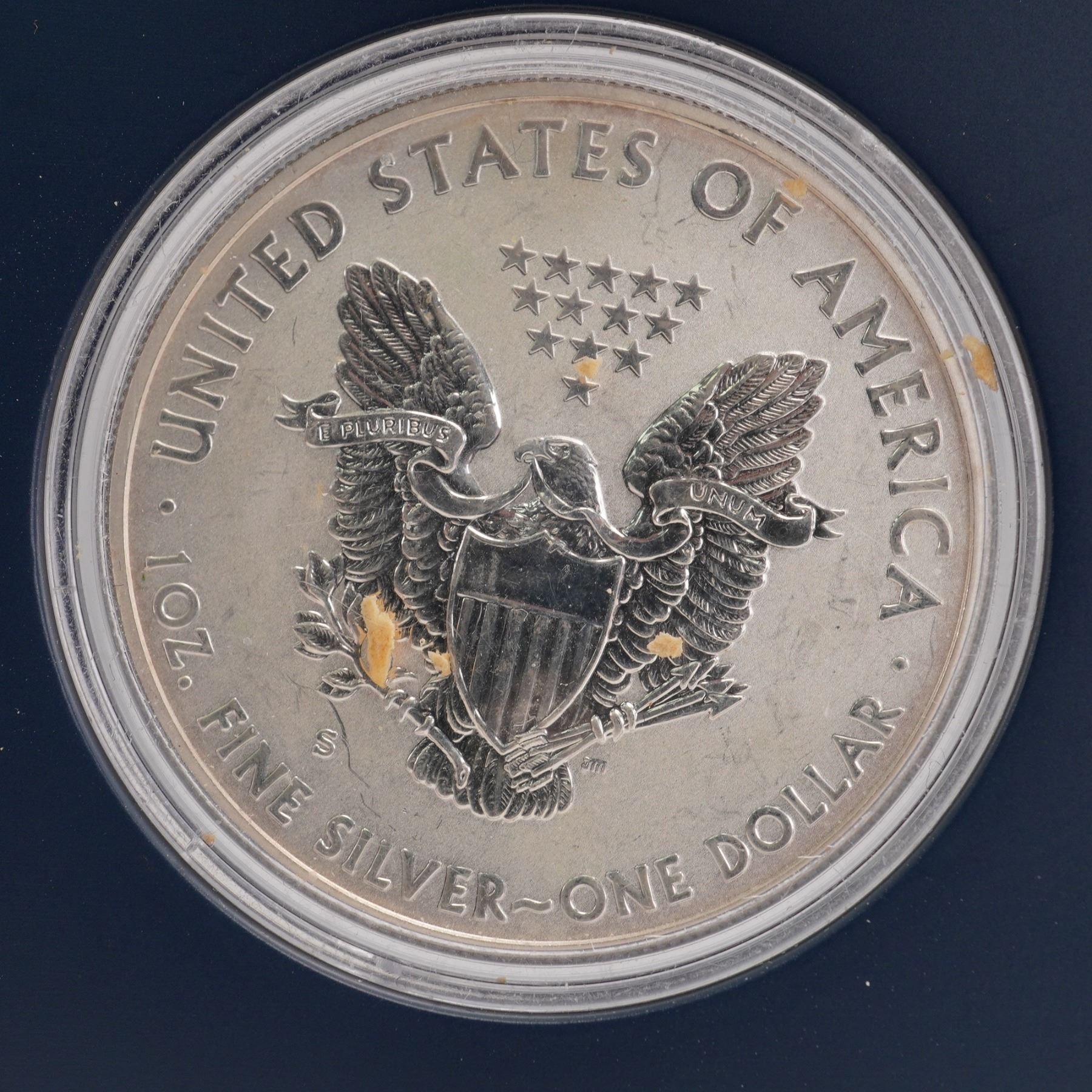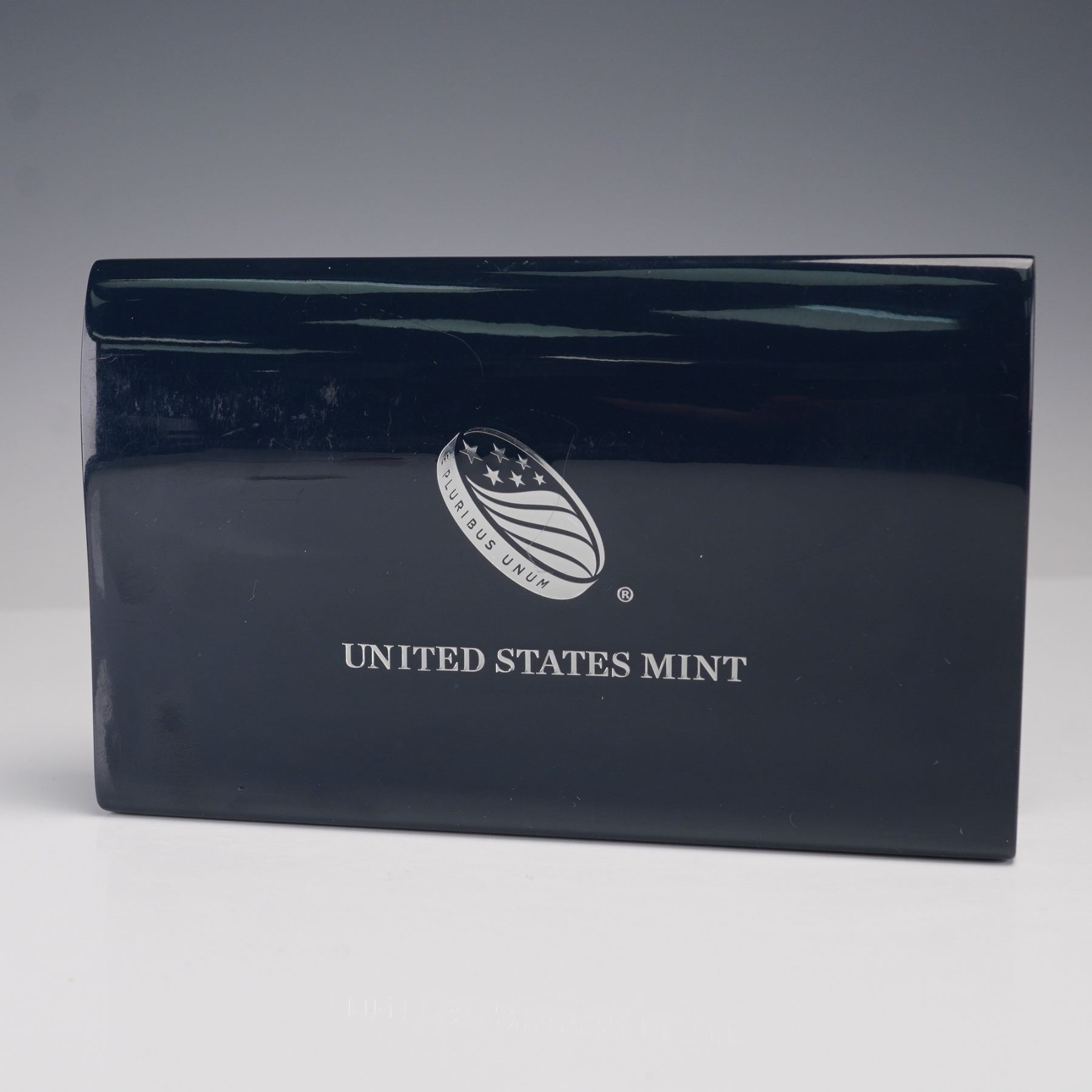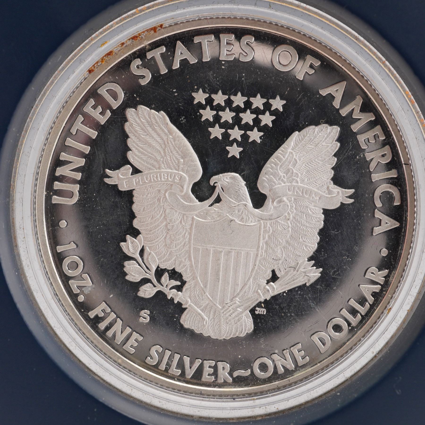 United States Mint 2012-S American Silver Eagle 2-Coin Set featuring one proof and one reverse proof coin. Each coin is struck in one troy ounce of .999 fine silver and bears the "S" mint mark indicating production at the San Francisco Mint. The obverse design on both coins depicts Adolph A. Weinman's historic Walking Liberty figure, originally used on the half-dollar from 1916 to 1947. Liberty is shown draped in the American flag, striding toward the sunrise, carrying branches of laurel and oak. Inscriptions include "LIBERTY," "IN GOD WE TRUST," and the year "2012." The reverse of each coin displays John Mercanti's heraldic eagle with shield design, featuring a bundle of arrows in the eagle's right talon and an olive branch in its left. A ribbon in the beak reads "E PLURIBUS UNUM," and a cluster of 13 stars represents the original colonies. The reverse also includes the inscriptions "UNITED STATES OF AMERICA," "1 OZ. FINE SILVER-ONE DOLLAR," and the "S" mint mark. Coins are presented in the original United States Mint clamshell-style display case with navy blue exterior and velvet-lined interior. Box: 6.75"L x 4"W x 1.75"H.