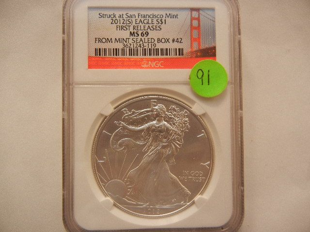 2012-S American Silver Eagle, First Releases, .999 Fine Silver, 1 Troy Oz., Graded by NGC MS69