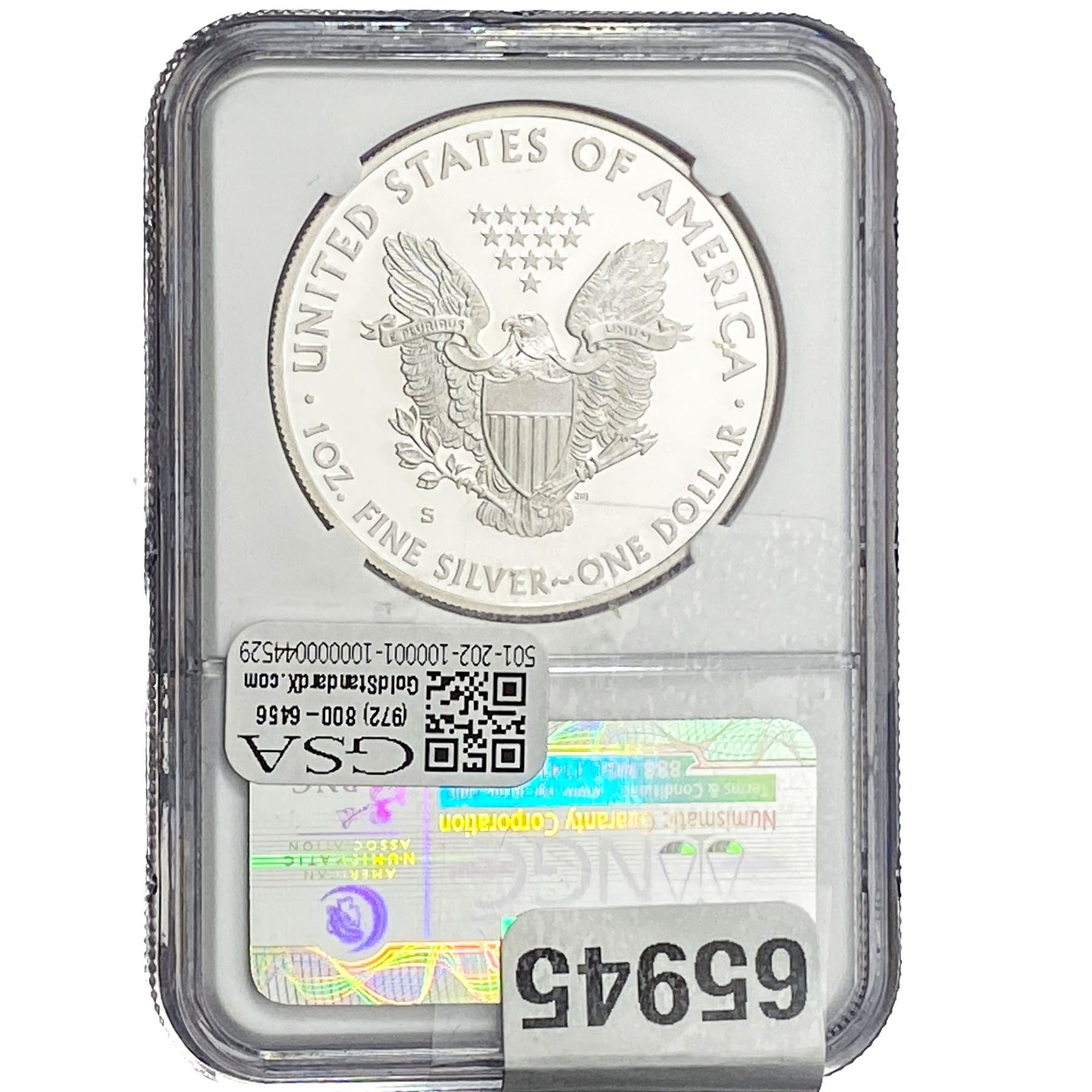 e. Coins sold referencing a third-party grading service are sold “AS IS” without any express or implied warranty, except for a guarantee by GSA that they are genuine. Removal or alteration of the holder, voids all of Bidder’s claims concerning that Product. Certain warranties may be available from the grading services and Bidders are referred to them for further details: Numismatic Guaranty Corporation (NGC), PO Box 4776, Sarasota, FL 34230, www.ngccoin.com/services/writtenguarantee.asp; Professional Coin Grading Services (PCGS), PO Box 9458, Newport Beach, CA 92658, www.pcgs.com/guarantee.html; ANACS, 6555 S. Kenton St., Ste. 303, Englewood, CO 80111; and Independent Coin Grading Co. (ICG), 7901 East Bellview, Ave., Suite 50, Englewood, CO 80111.