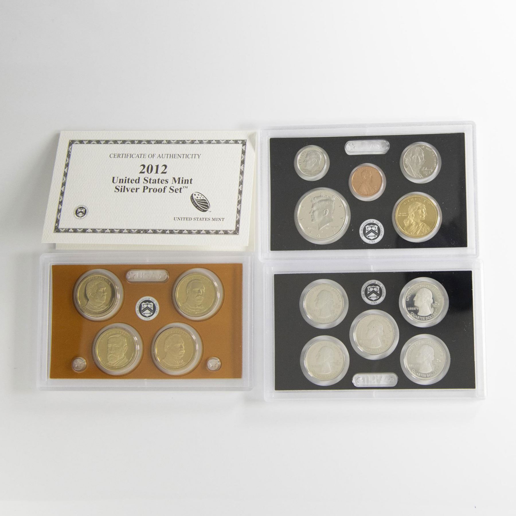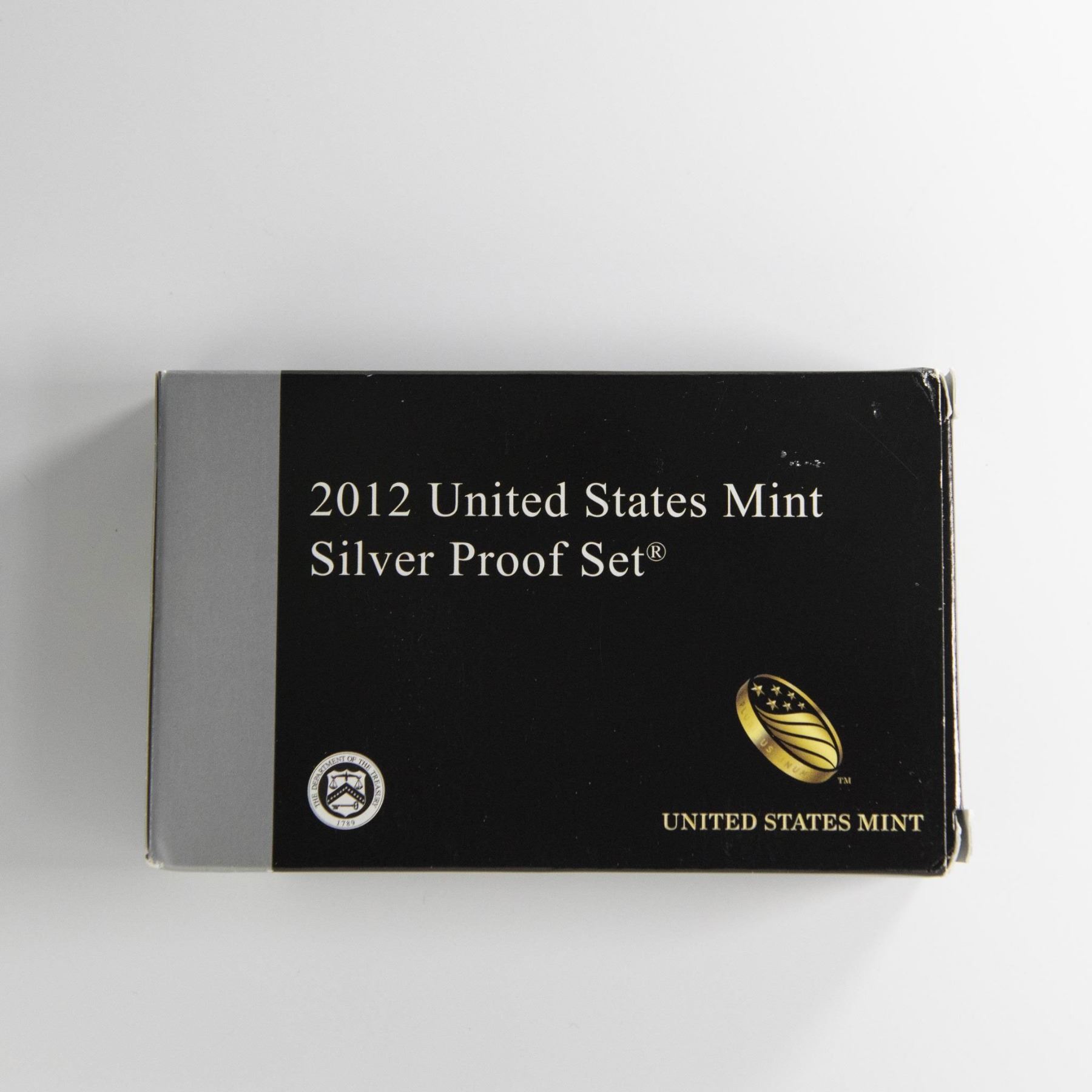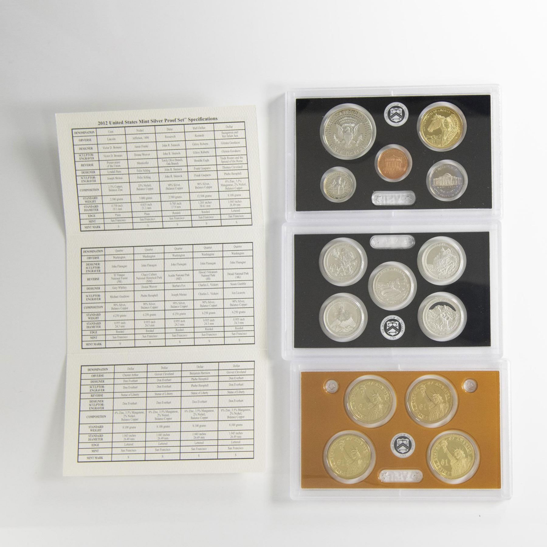 A collection of 14 coins from 2012 San Francisco Mint. 5 America the Beautiful Quarters, 4 Presidential Dollar Coins, 1 Native American Dollar Coin, 1 Kennedy Half-Dollar; 1 Jefferson Nickle; 1 Roosevelt Dime; and 1 Lincoln Penny. The 14 proof coins are enchased in three clear plastic cases. A case is approximately: 5.25"L x 3.25"W x 0.25"H. This item has its original box: 5.5"L x 3.5"W x 1"H.