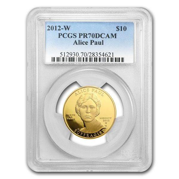 VDG**78354Year**2012MintMark**W-West Point Grade**PR-70 DCAM Denomination**10Diameter**26.49mmThickness**1.88mmInnerPack**N/AOuterPack**N/ARemarks**Alice Paul has the distinction of being the only woman featured on a First Spouse gold coin that was