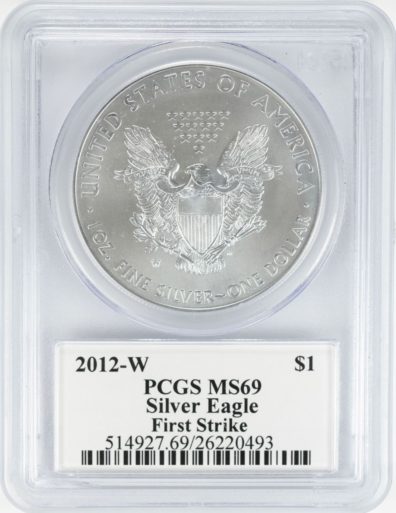 One 2012-W $1 American Silver Eagle Coin PCGS MS69 First Strike Mercanti Signature.