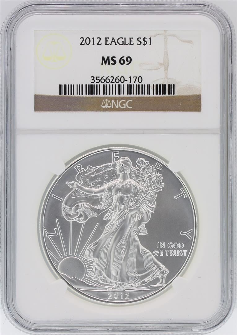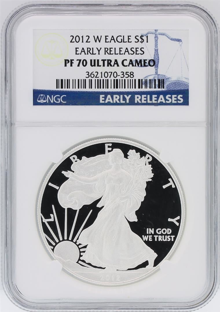 One American Silver Eagle Dollar Coin Set (lot of 2) featuring: 2012-W NGC PF70 Ultra Cameo Early Releases American Silver Eagle Dollar and 2012 NGC MS69 American Silver Eagle Dollar. NGC Certified.