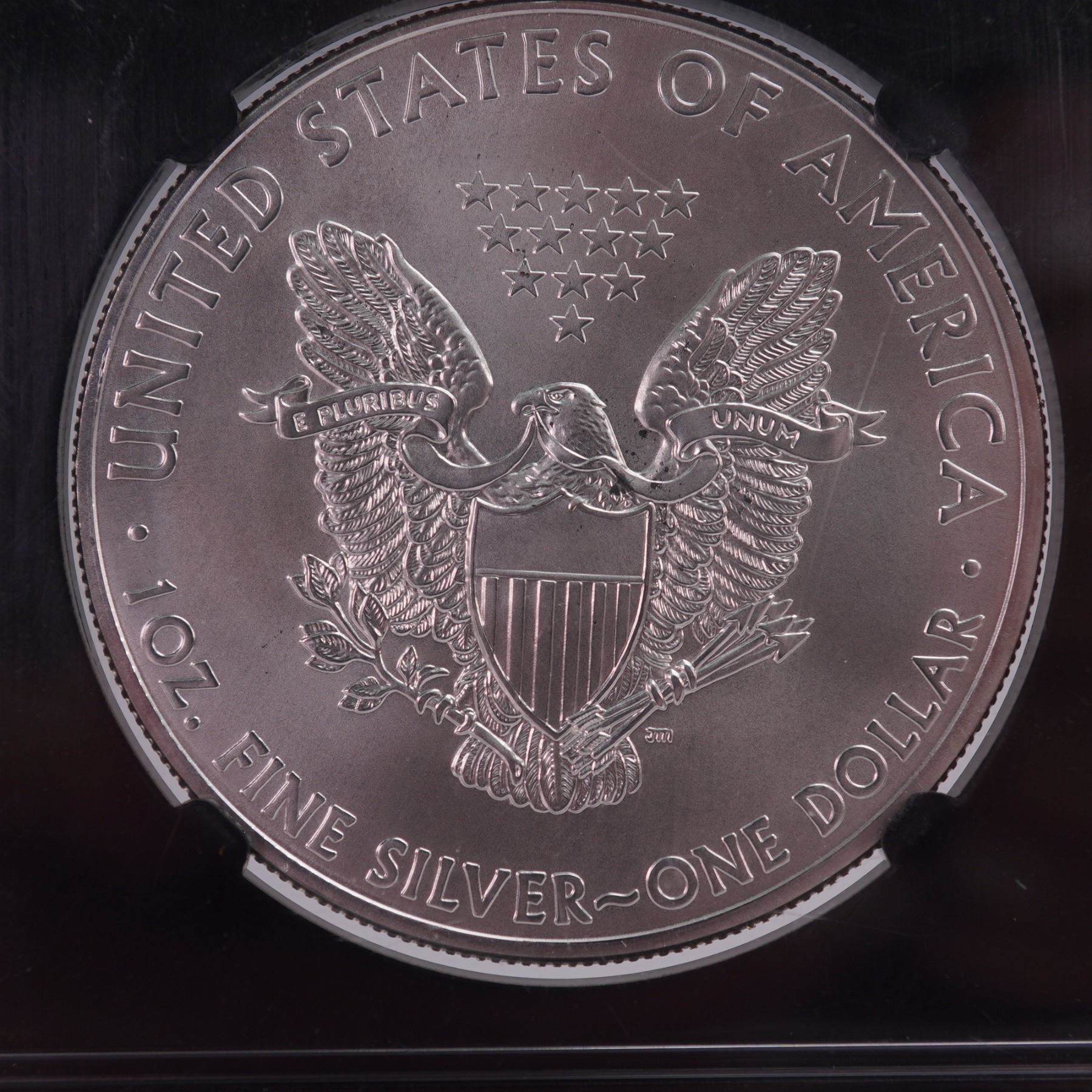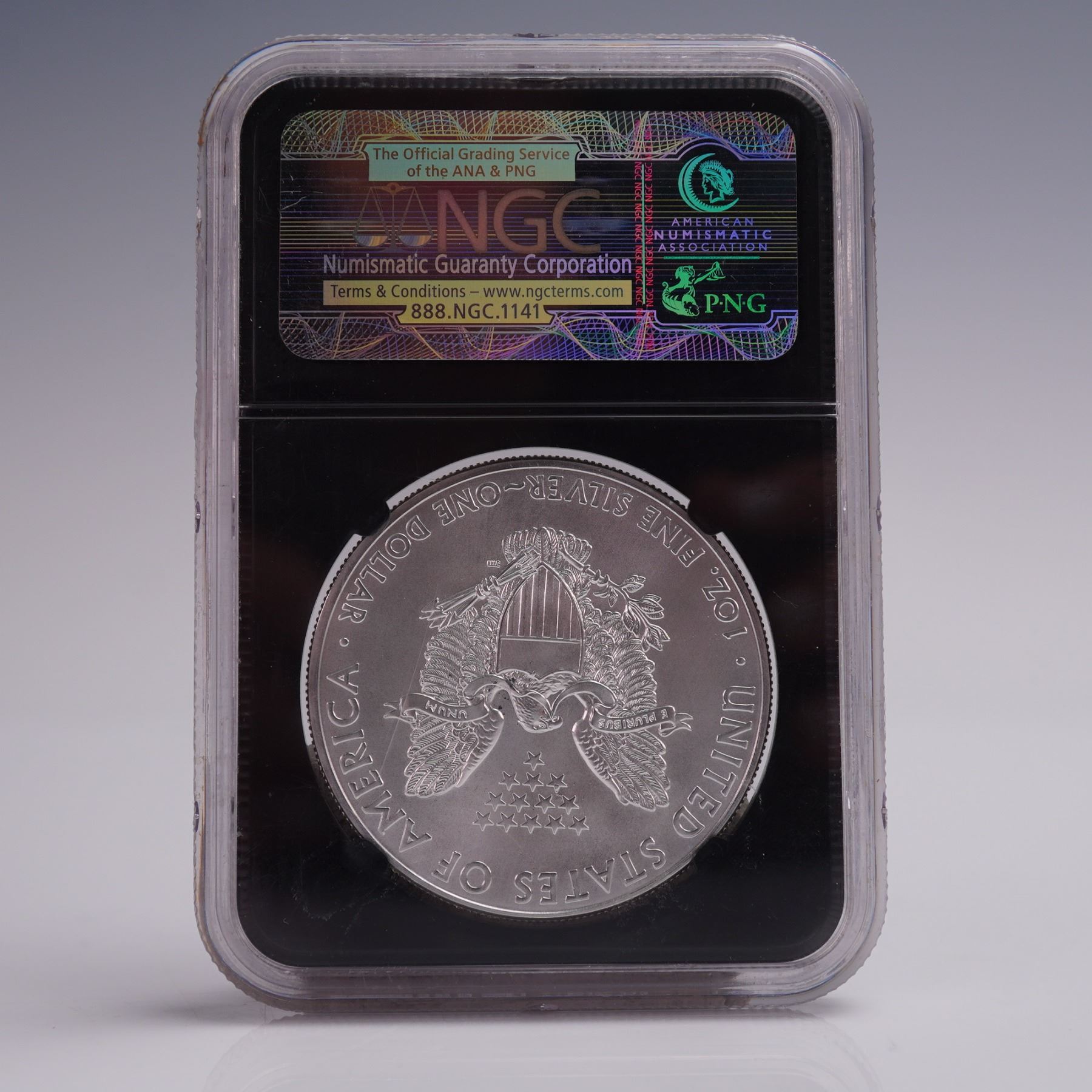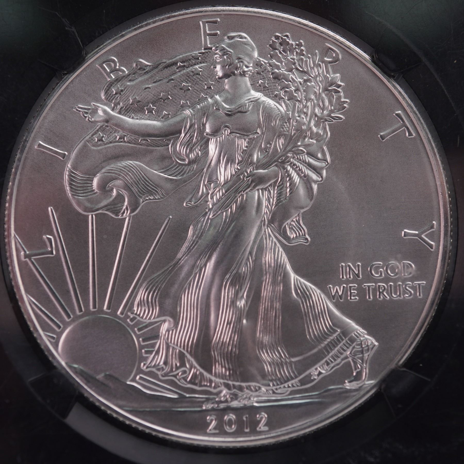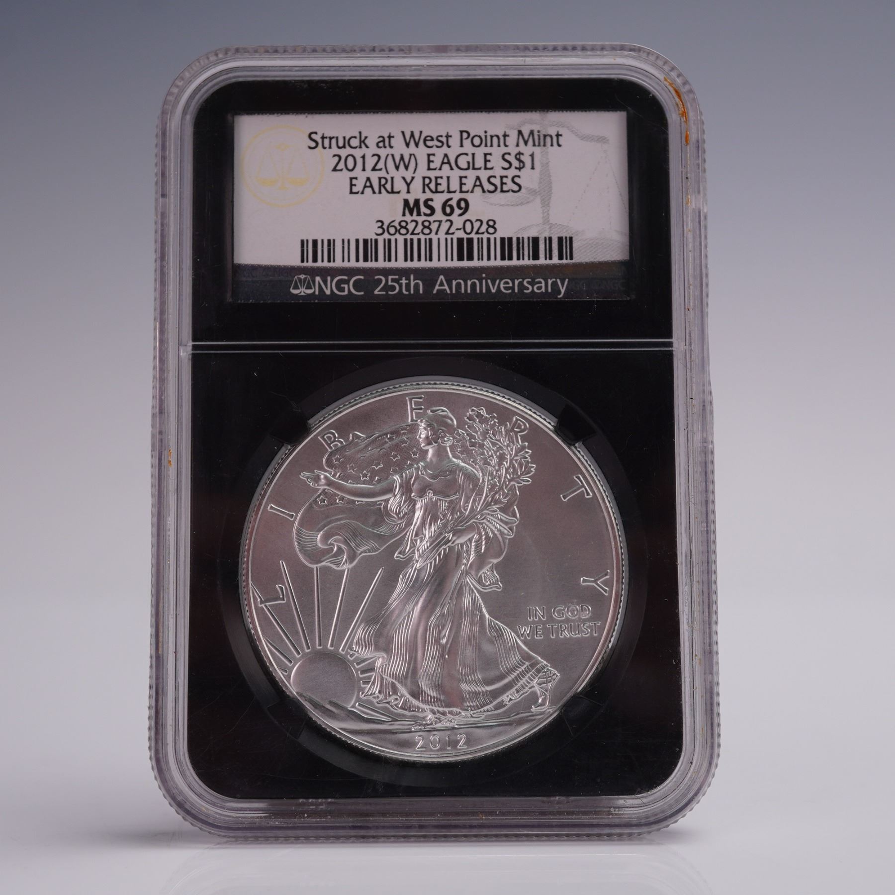This 2012 American Silver Eagle one-ounce bullion coin was struck at the West Point Mint and bears the "W" mintmark, signifying its origin. Certified by NGC and graded Mint State 69, it has been designated as an Early Release. Struck in .999 fine silver. The obverse features Adolph A. Weinman's timeless Walking Liberty design, originally introduced in 1916, with Lady Liberty draped in the American flag, striding toward the dawn of a new day while holding laurel and oak branches to symbolize civil and military glory. The reverse, designed by John Mercanti, displays a heraldic eagle with a shield, clutching arrows and an olive branch, with thirteen stars positioned above in tribute to the original colonies. Housed in a graded NGC slab for further preservation and authentication. Slab measures: 2.25"L x 0.25"W x 3.25"H. Coin diameter: 40.6 mm.