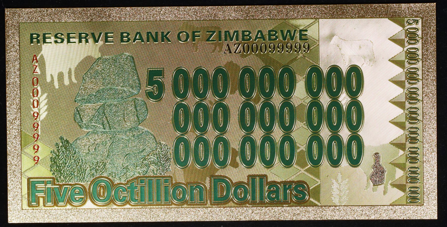 2012 Zimbabwe 5 Octillion Dollar Note Grades CU. During the years of 2008 and 2009, The inflation rate of the Zimbabwe Dollar Grew to 250,000,000% at its peak. This was later linked to the Central Bank uncontrollably printing money and the global economic crisis and the time.