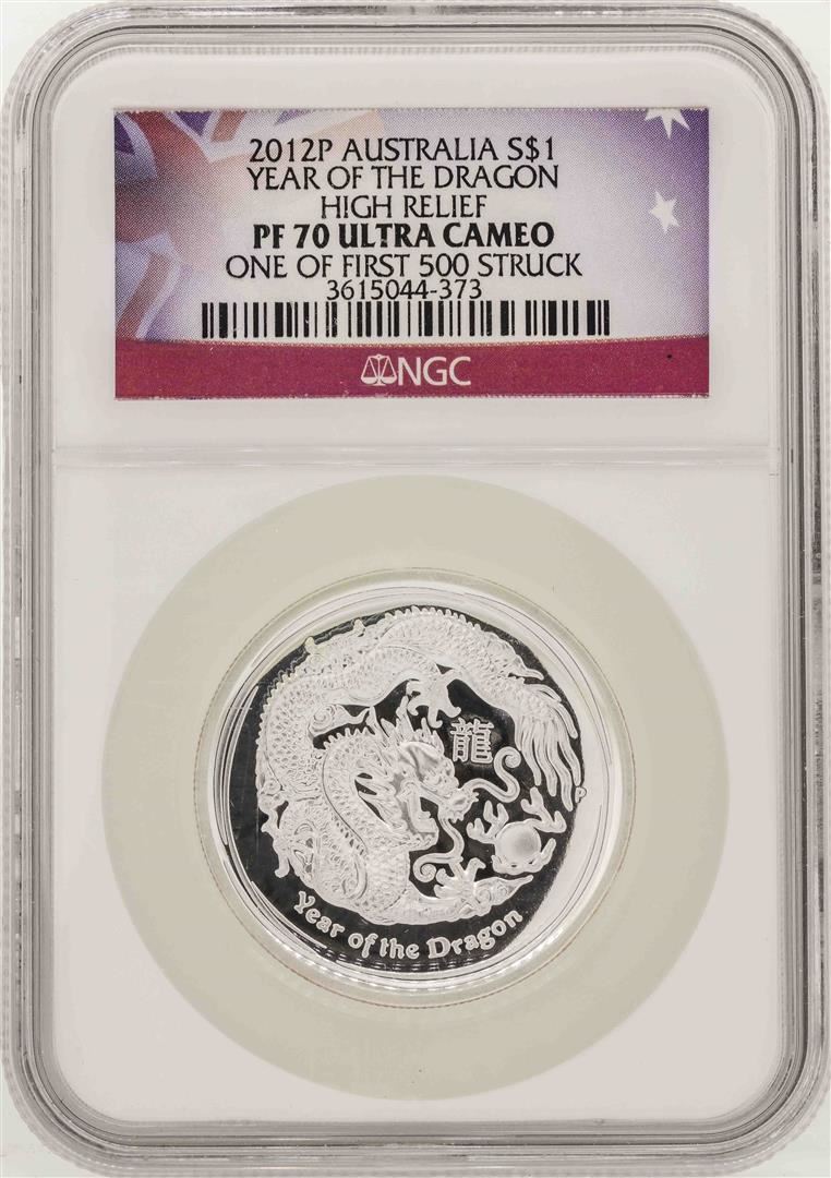 One 2012P Australia $1 Year of the Dragon High Relief Coin NGC PF70 Ultra Cameo. NGC Certified.