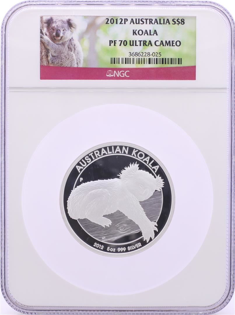 One 2012P Australia $8 Proof Koala 5 oz. Silver Coin NGC PF70 Ultra Cameo. NGC Certified.