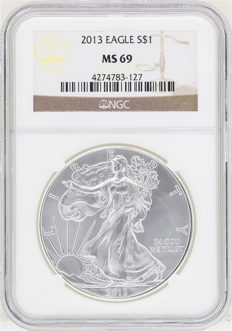 One 2013 $1 American Silver Eagle Coin NGC MS69. NGC Certified.