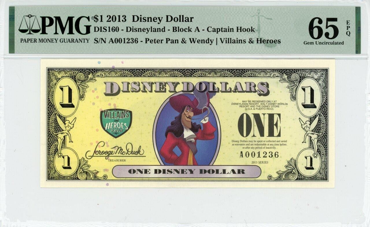 One 2013 $1 Captain Hook Disney Dollar PMG 65EPQ.
