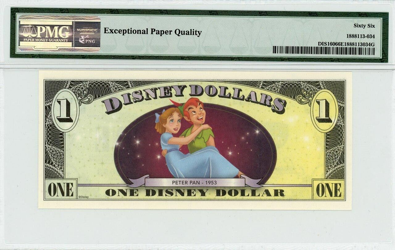 One 2013 $1 Captain Hook Disney Dollar PMG 66EPQ.