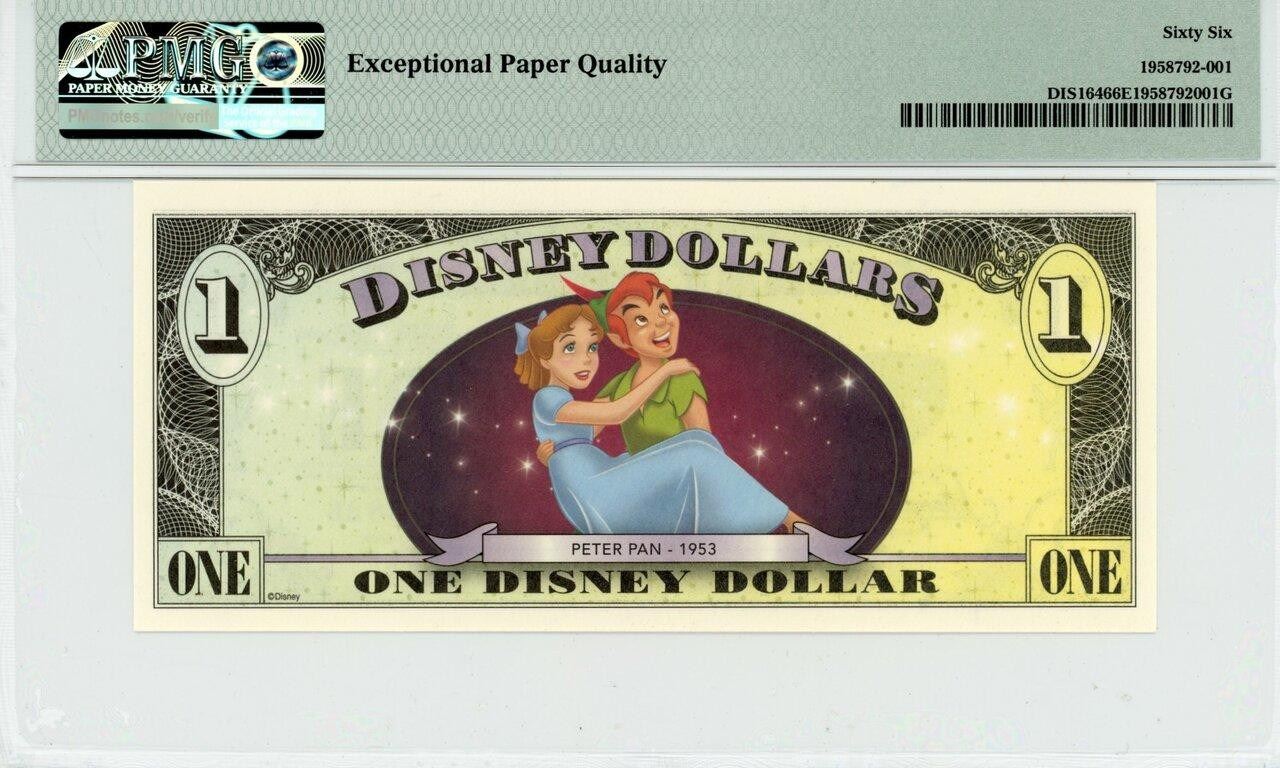 One 2013 $1 Captain Hook Disney Dollar PMG 66EPQ.
