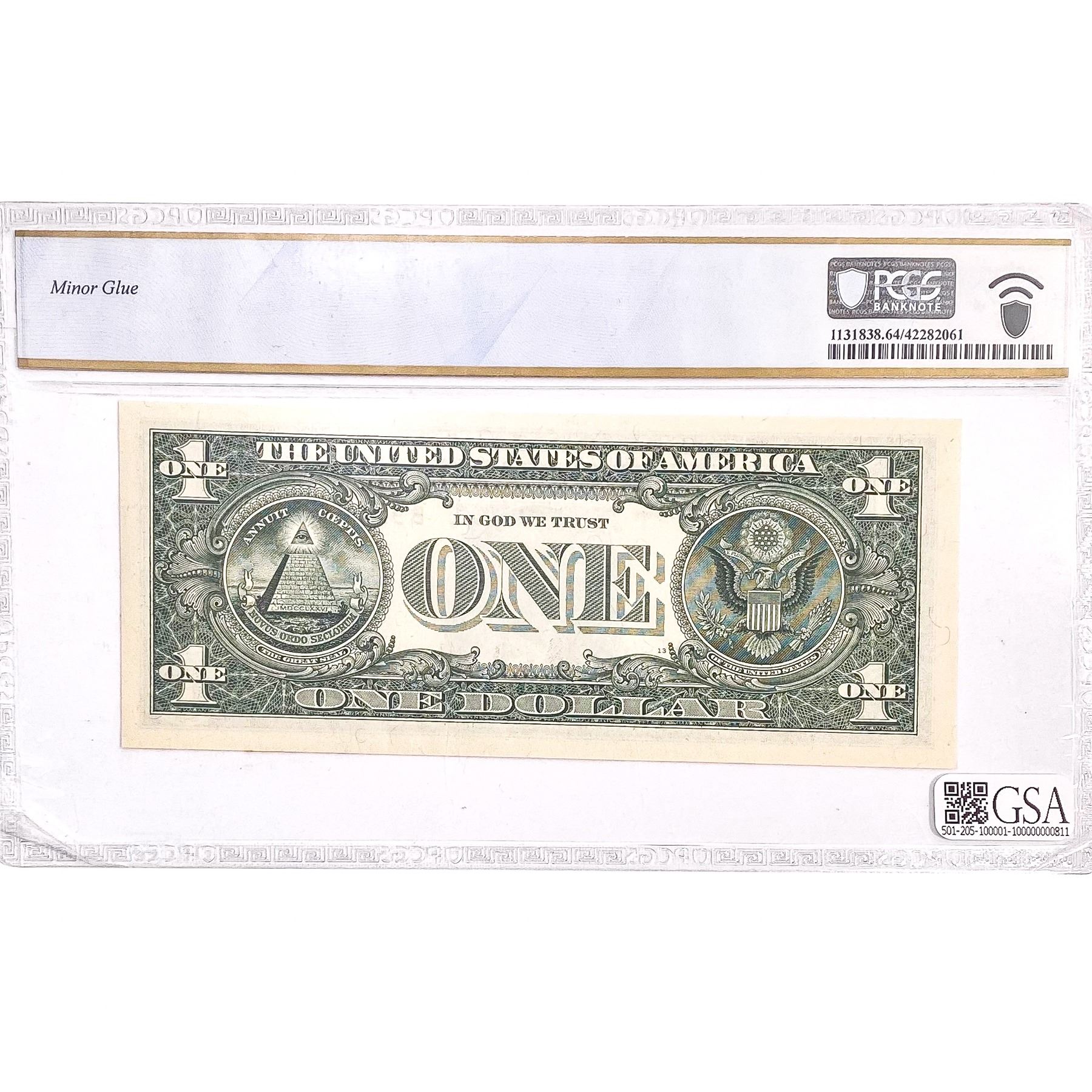 f. Notes sold referencing a third-party grading service are sold "AS IS" without any express or implied warranty, except for guarantee by GSA that they are genuine. Grading, condition or other attributes of any Product may have a material effect on its value and the opinion of others, including third-party grading services such as PCGS Currency and PMG may differ with that of GSA. GSA shall not be bound by any prior or subsequent opinion, determination, or certification by any grading service. Bidders specifically waive any claim to right of return of any Product because of the opinion, determination, or certification, or lack thereof, by any grading service. Certain warranties may be available from the grading services and Bidders are referred to them for further details: Paper Money Guaranty (PMG), PO Box 4711, Sarasota, FL 34230; PCGS Currency, PO Box 10470, Peoria, IL 61612-0470; PCGS Gold Shield, PO Box 9458, Newport Beach, CA 92658. Third-party graded notes are not returnable for any reason whatsoever.