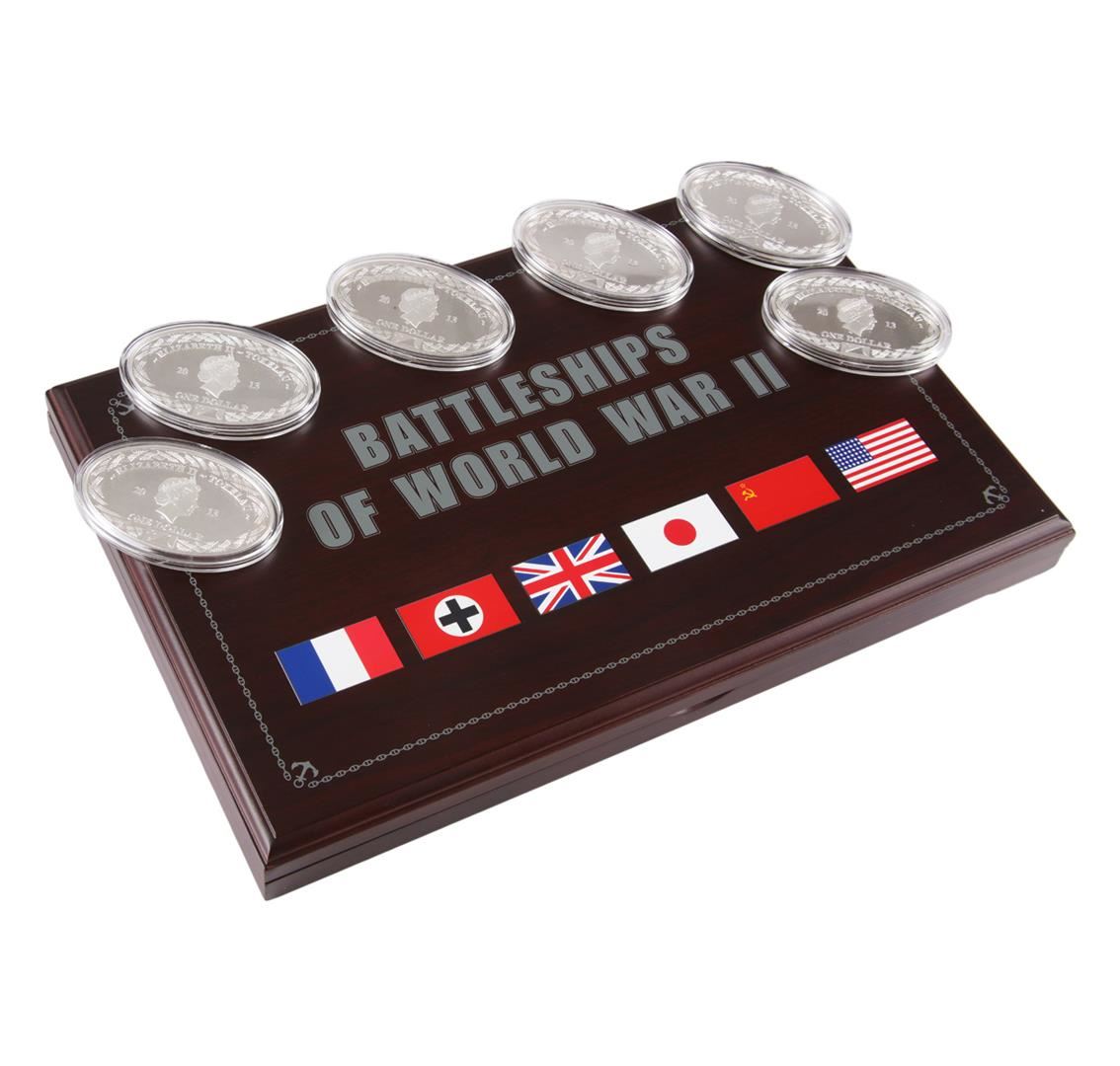 One 2013 $1 Oval Battleships of World War II Proof Clad Coin Set. A set of (6) Coins commemorating the Battleships of World War II which was issued in 2013 by Tokelau with a limited mint of only 3,000 sets being issued.