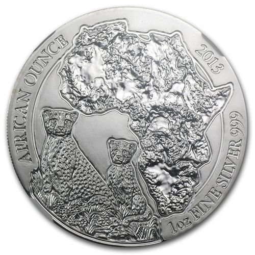 2013 1 oz Silver Rwanda African Cheetah MS-70 NGC **|**|** Year: 2013 ; Mint Mark: MS-70 ; Denomination: 50 RWF Franc ; MSRP: $200
