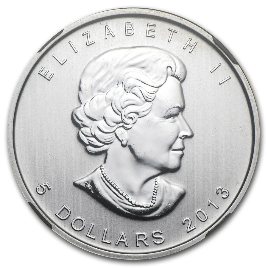 #77250 Year: 2013 Grade: Mint Error MS-66 Grade Service: NGC Denomination: $5 Metal Content: 1 troy oz Purity: .9999 Manufacturer: Royal Canadian Mint Thickness: 3.29 mm Diameter: 38 mm