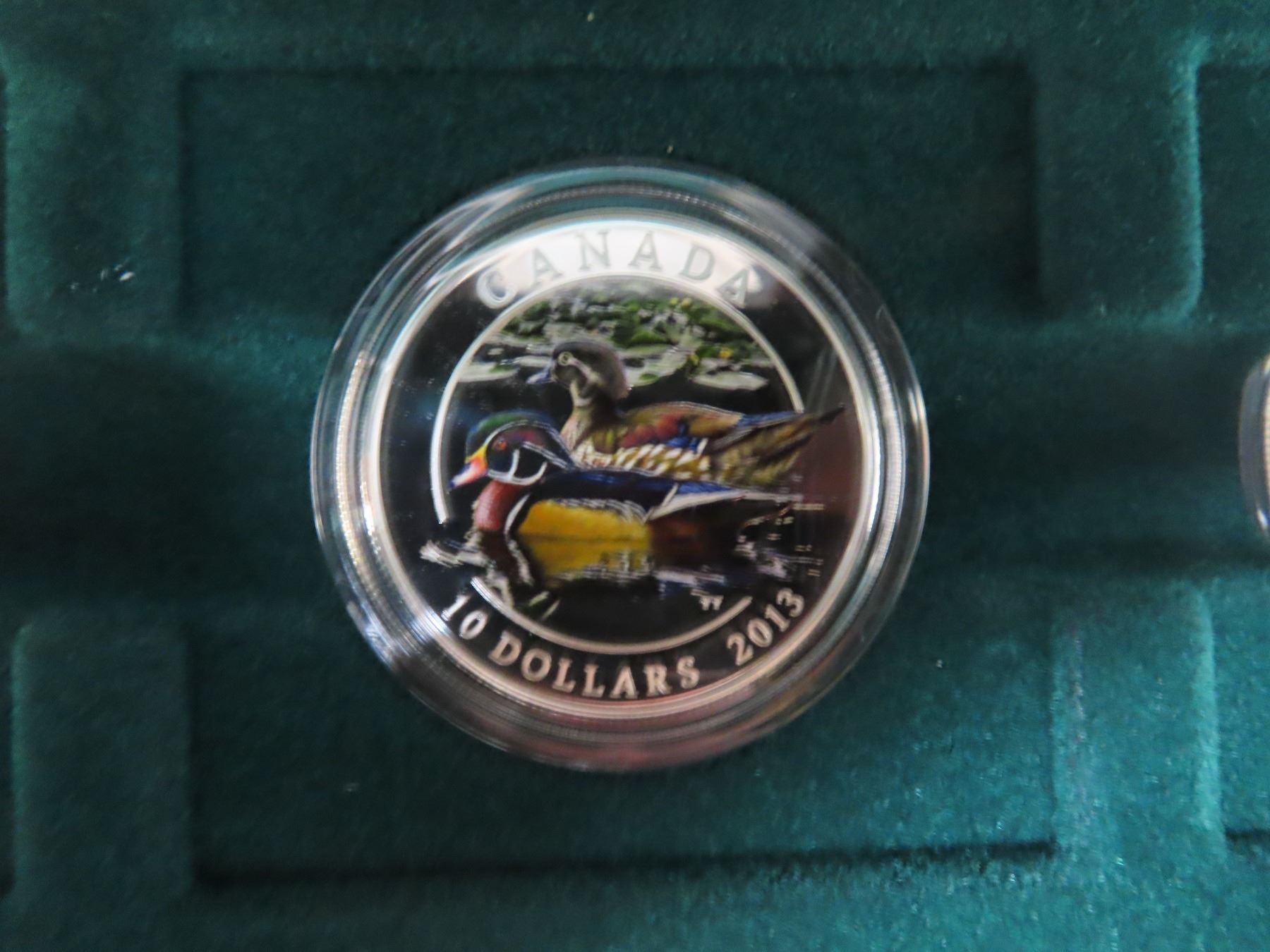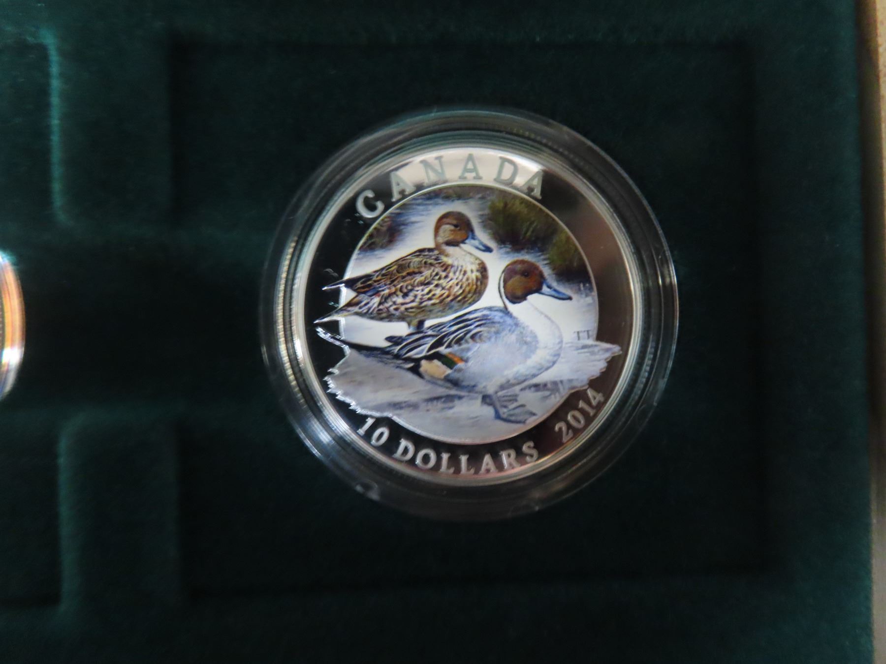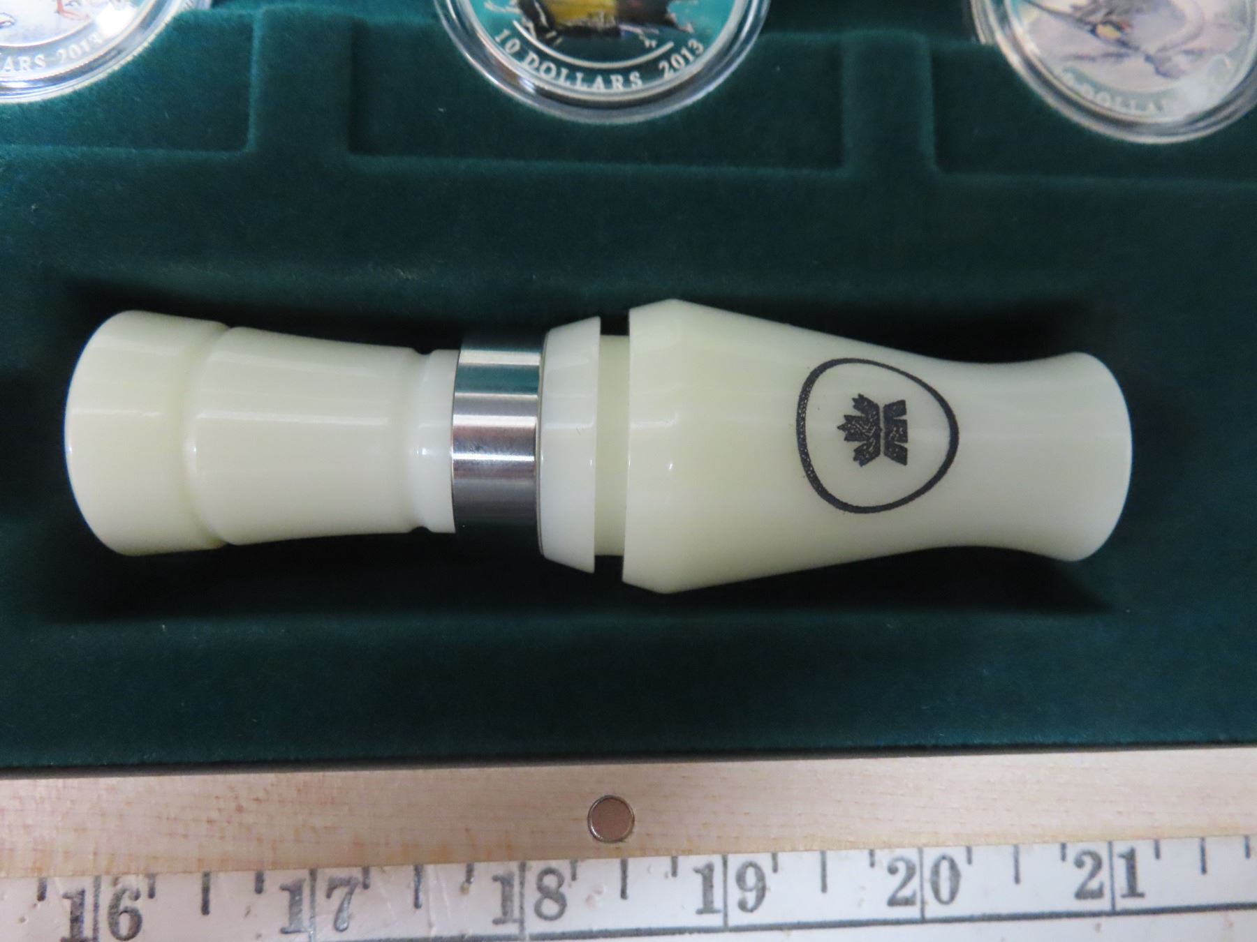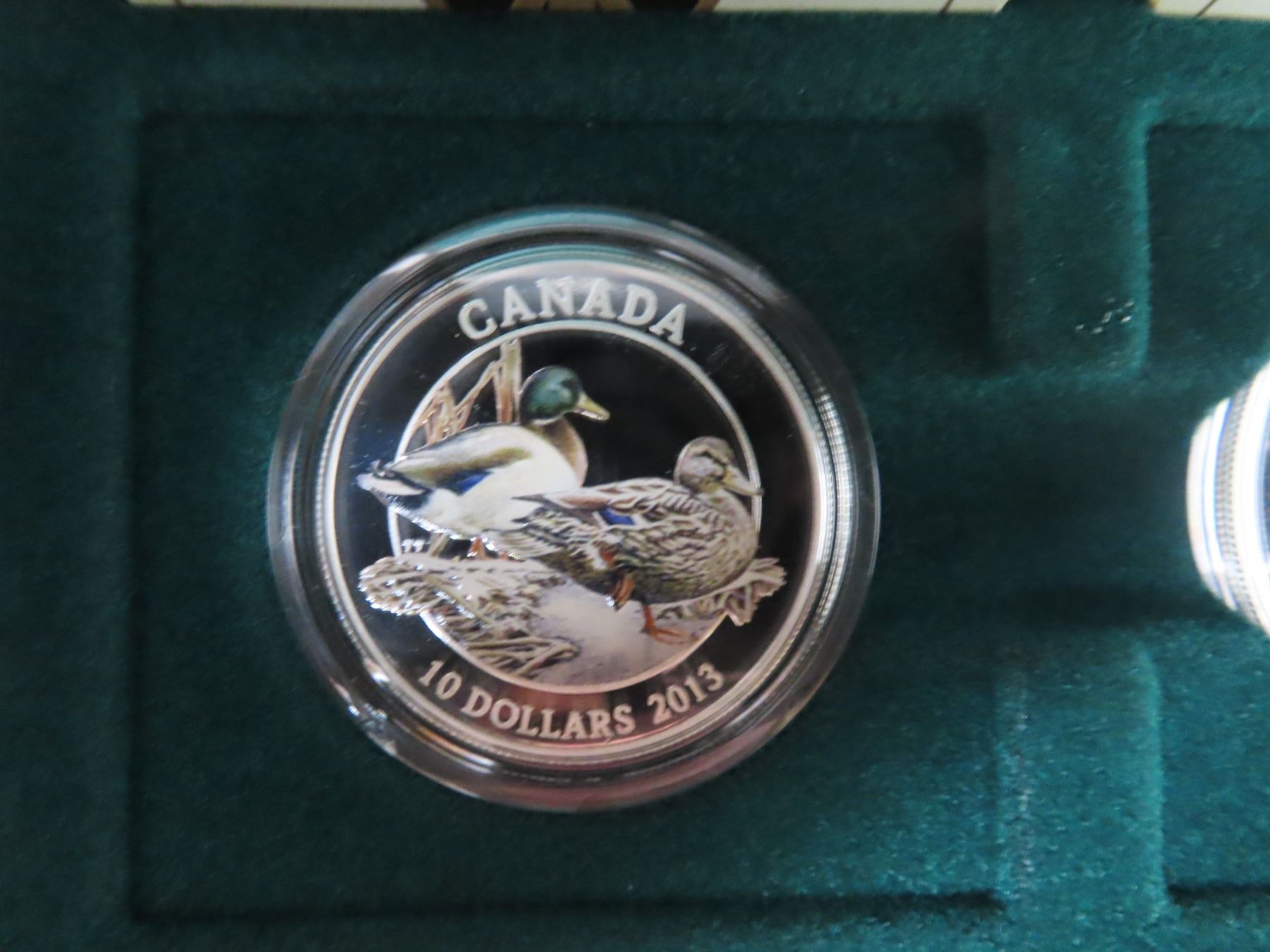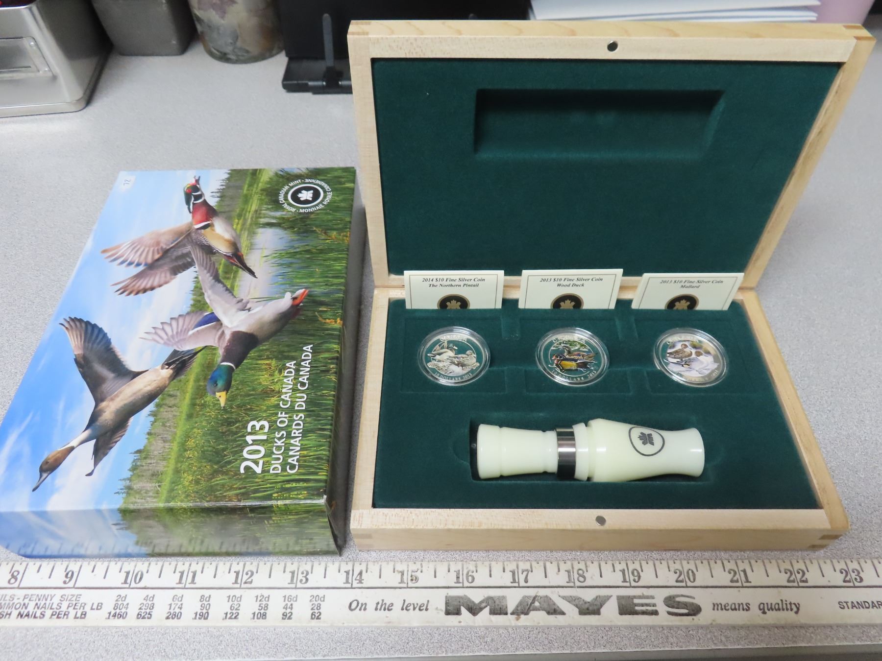 2013 $10 Ducks of Canada. Complete Set of 3 includes Mallard, Wood Duck & Northern Pintail. Colourized. Includes a Buck Brush Double duck call. Proof with Ultra Heavy Cameo. 99.99% pure Silver. Housed in its original Royal Canadian Mint case & box of issue plus Certificates of Authenticity.