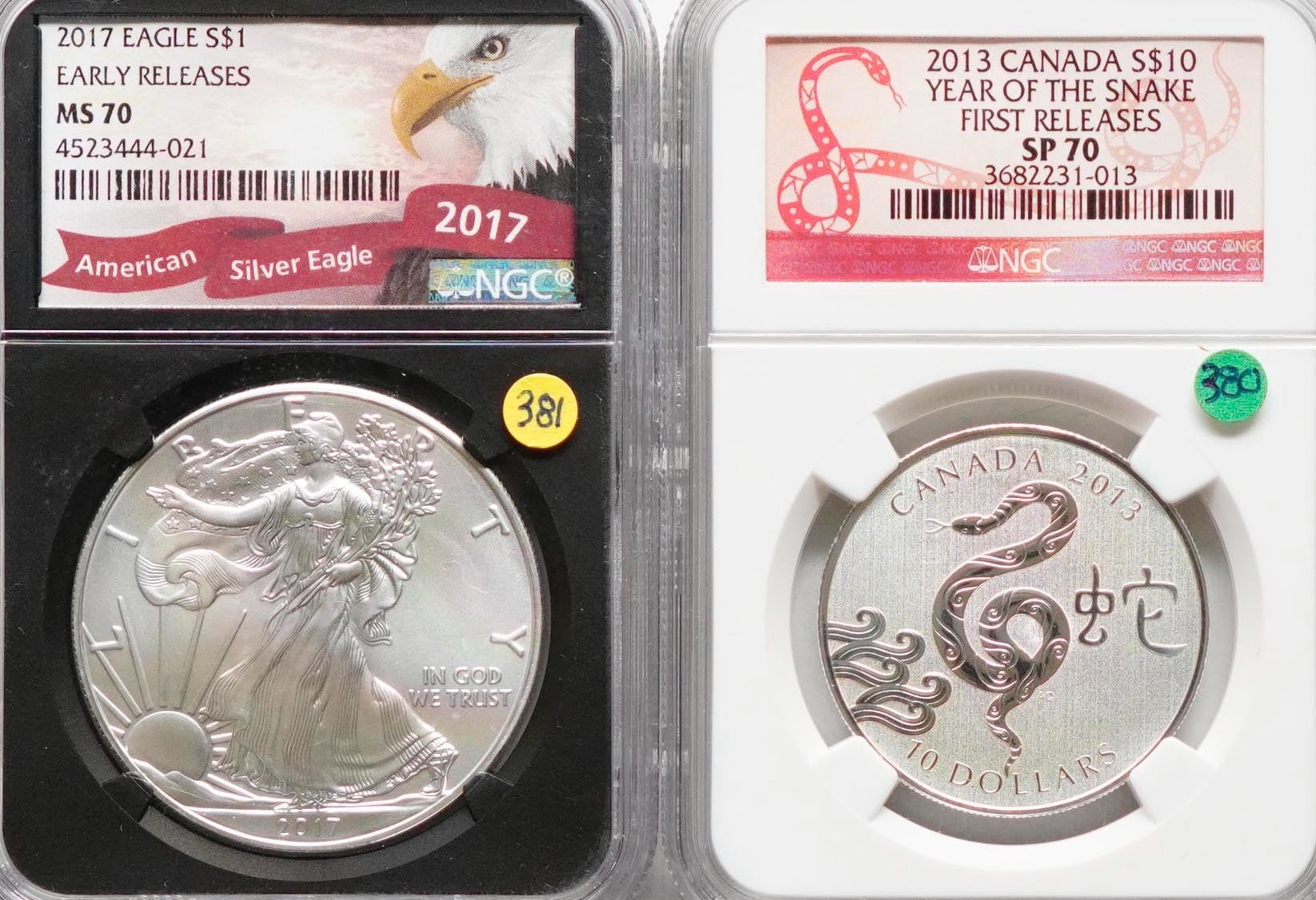 2013 $10 Snake NGC PERFECT SPECIMEN-70 & USA 2017 $1 Eagle NGC PERFECT Mint State-70. Lot of 2 coins.