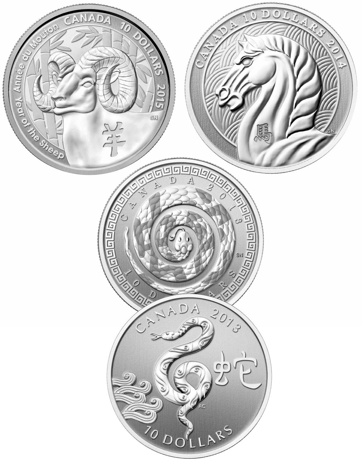 2013 $10 Special Edition Year of the Snake, 2014 $10 Year of the Horse & 2015 $10 Year of the Sheep - Lot of 3 Pure Silver Coins