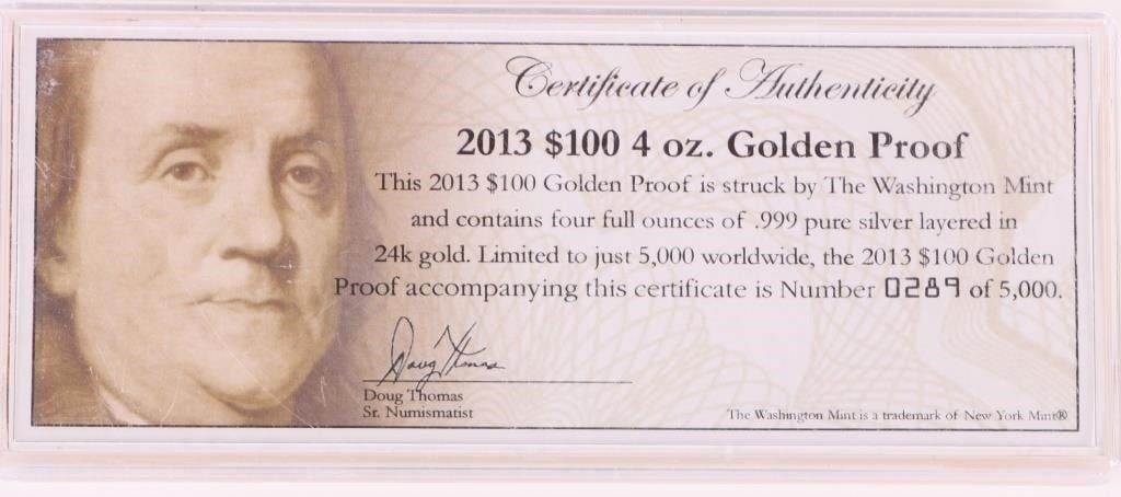 2013 $100 4 Ounce Golden Proof 289/5000. Struck by The Washington Mint, contains four full ounces of .999 pure silver layered in 24k gold. Limited to just 5000 worldwide, comes with certificate.