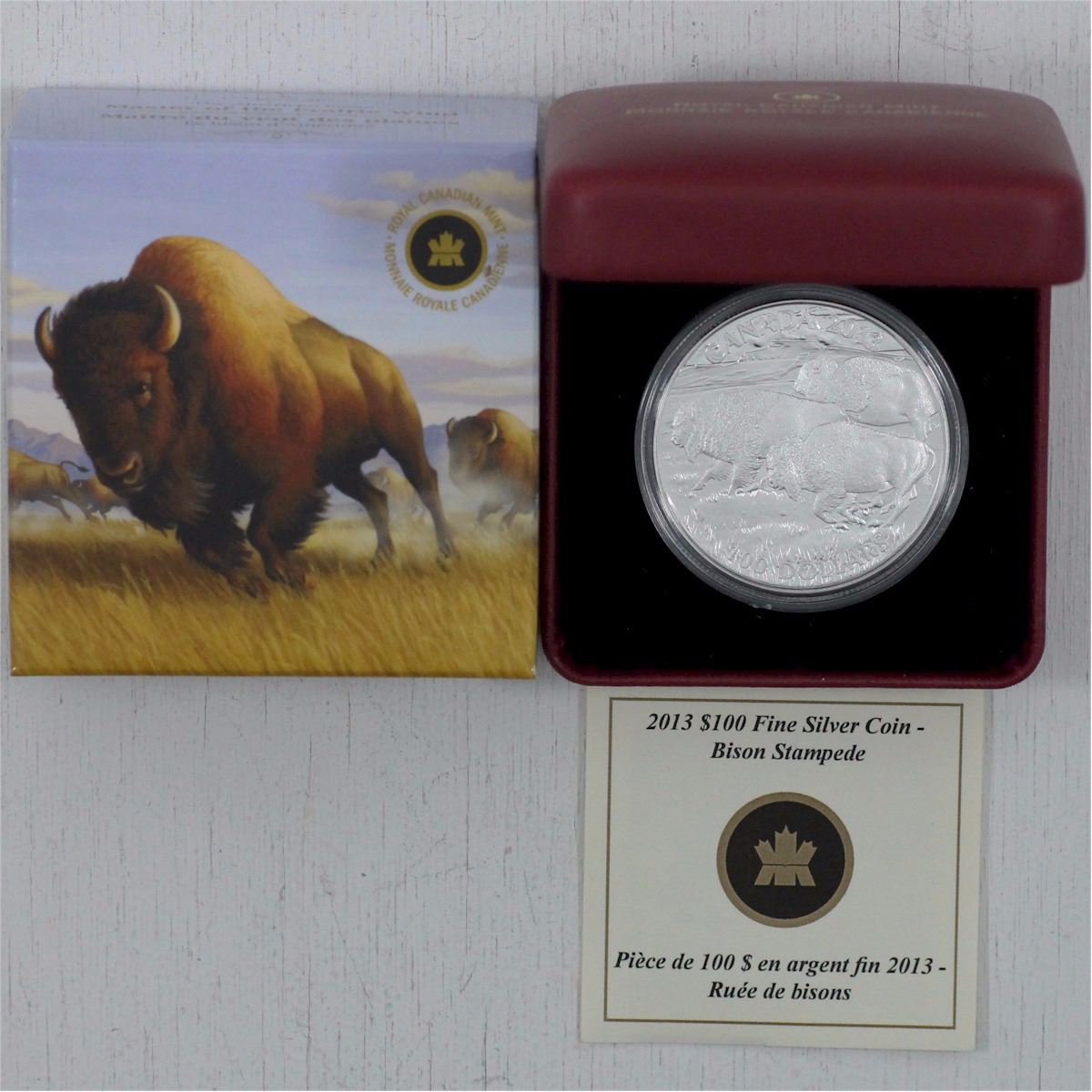 2013 $100 for $100 The American Bison Stampede Master of the Prairie Wind Fine Silver Coin (1st coin Series) TAX Exempt . Buyers Premium will be added on all items as per our terms of sale. We accept Paypal, Credit Card, E-Transfer Payments, Cheque or Money Orders (there is an additional 3% fee for using Paypal or Credit Card). All invoices will be emailed immediately following the auction, please contact us if you would like to pay by credit card or receive a new revised lower total for mailing in payment or sending an e-transfer (3% discount). All Items Are Sold "AS IS", no returns
