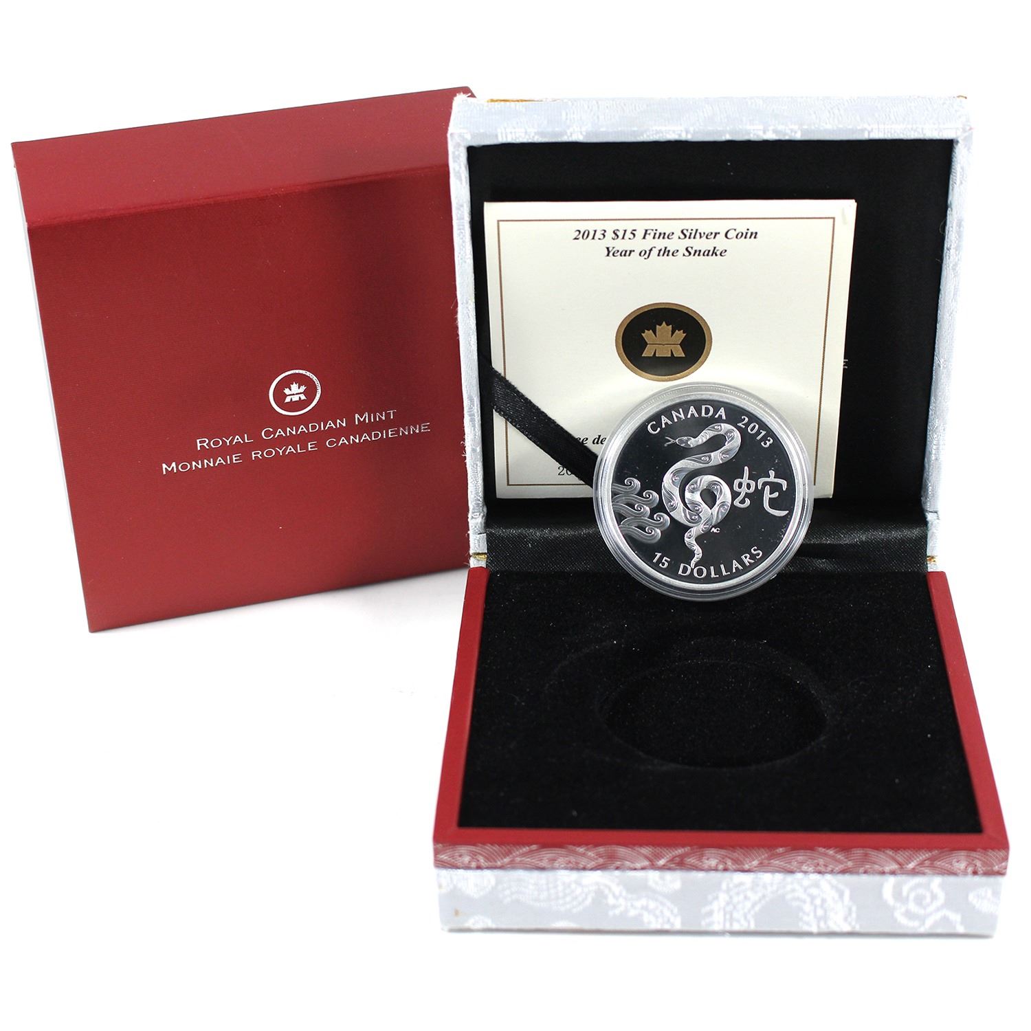 2013 $15 Zodiac-Year of the Snake 1oz .9999 Silver Coin. Glue lifting at edges of outer box (Tax Exempt)