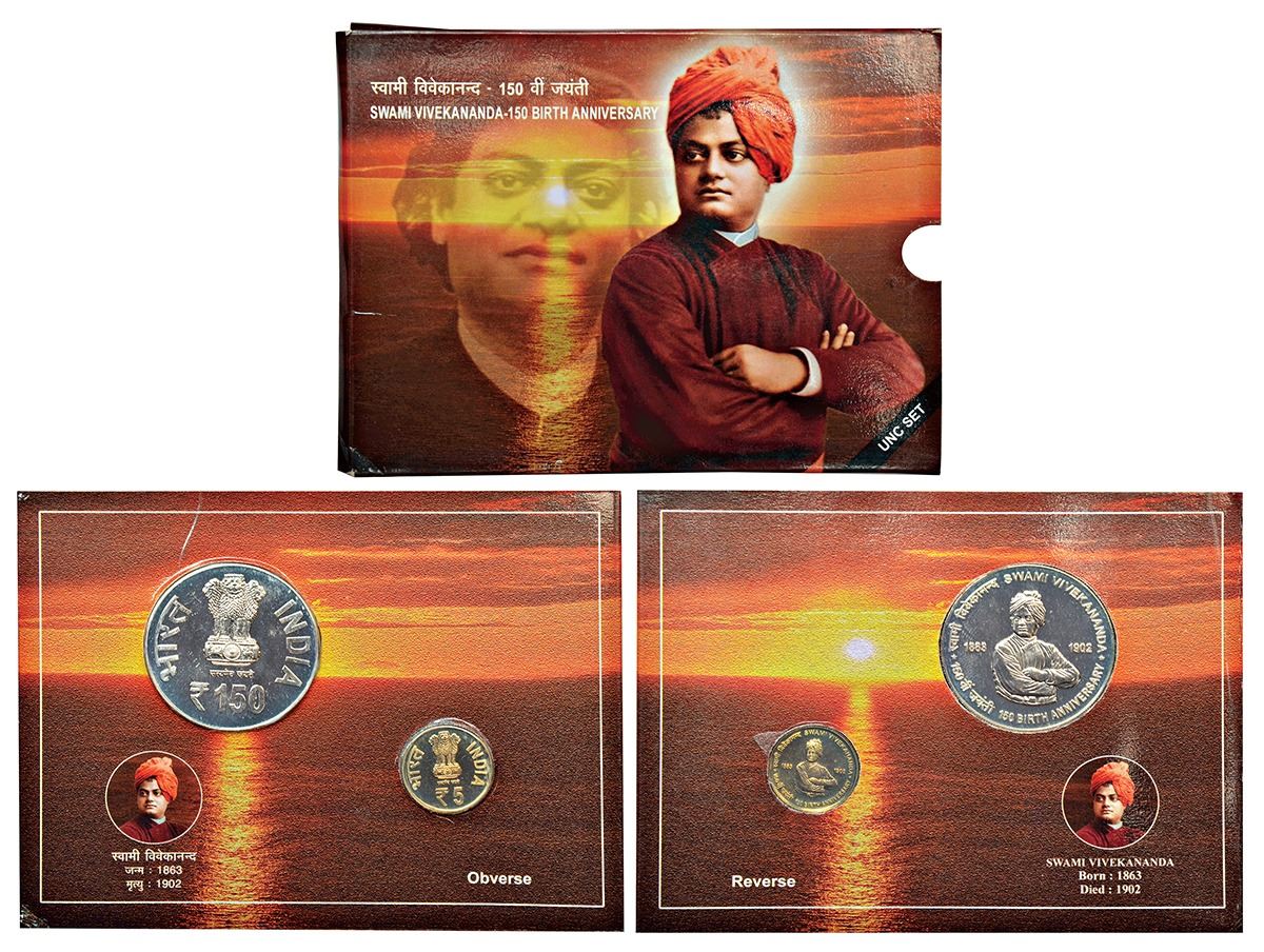 2013, 150th Birth Anniversary of Swami Vivekananda, UNC set of 2 coins, 150 rupees and 5 rupees, in original mint packing.