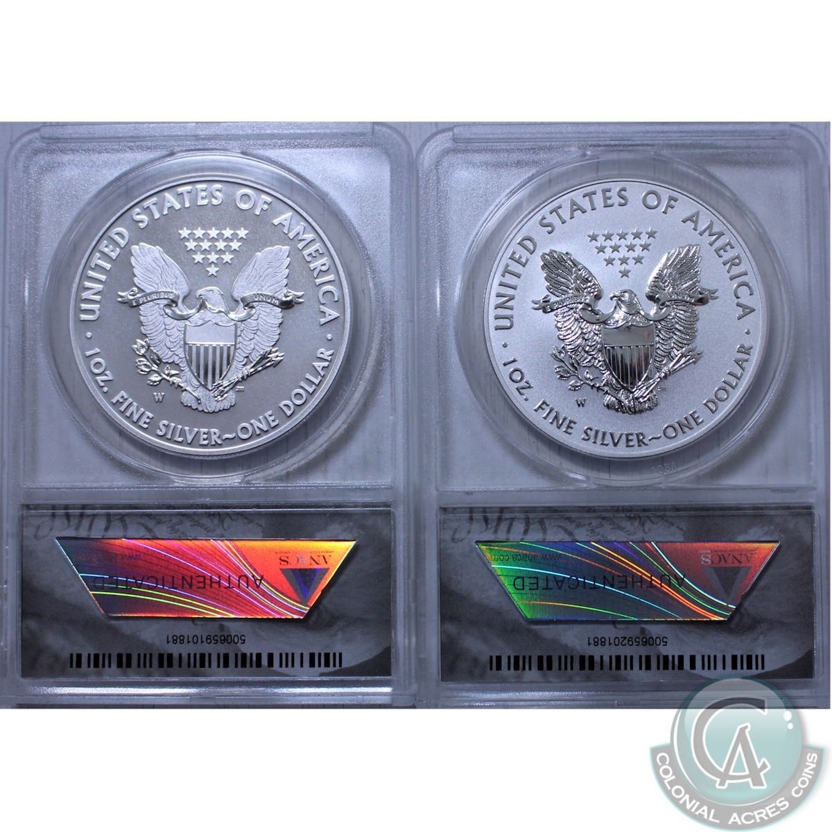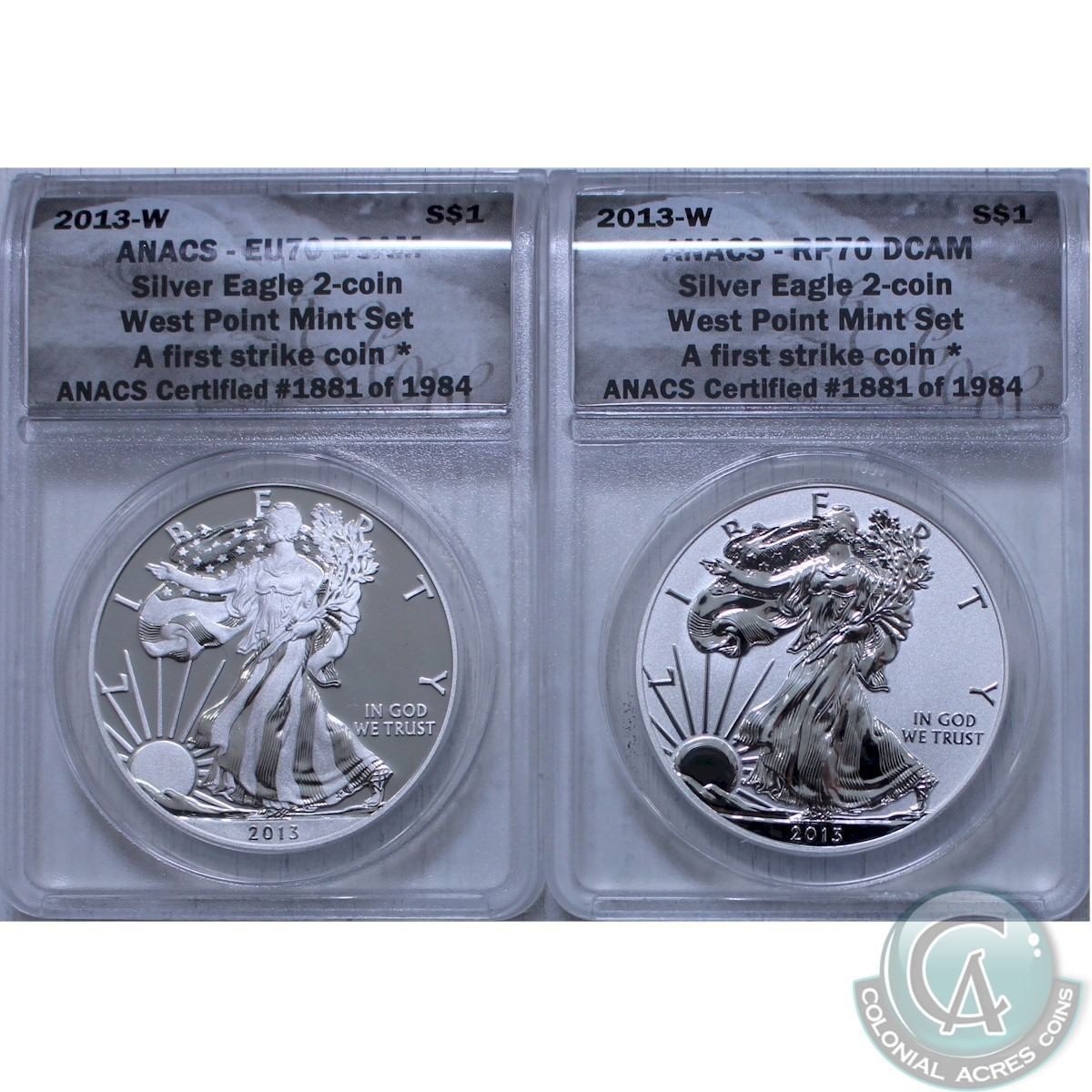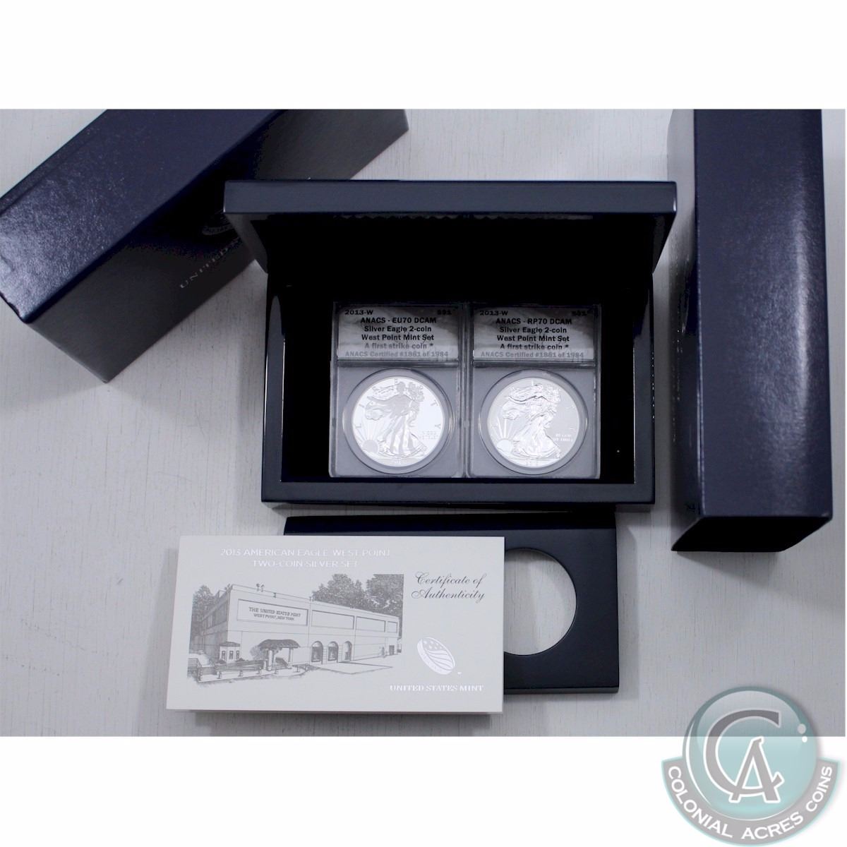 2013 2-Coin Silver American Eagle $1 West Point Set both coins are a First Strike ANACS Certified EU70 & RP70 Deep Cameo. Coins comes with original display box and certificate.