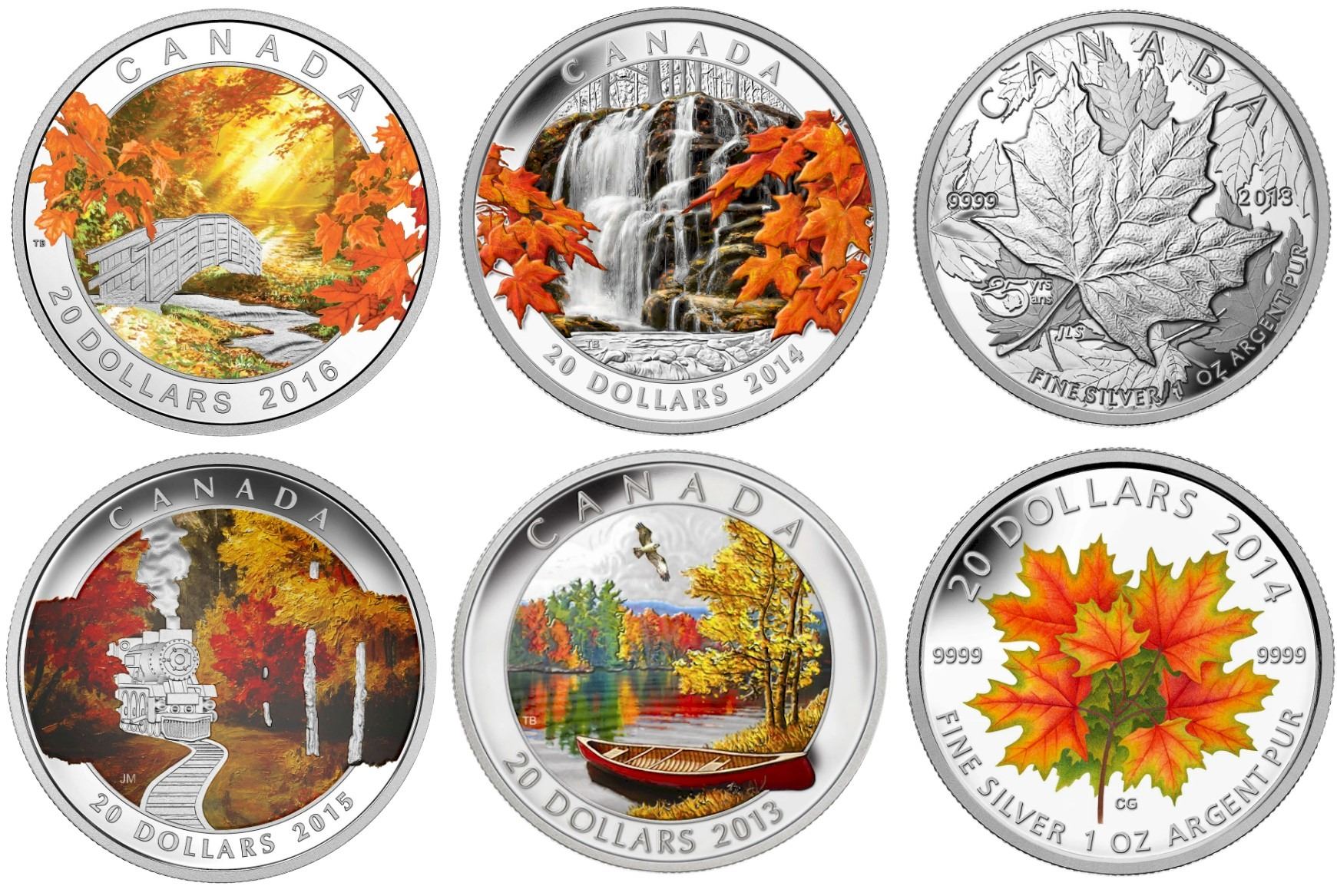 2013 $20 Autumn Bliss, 2014 $20 Autumn Falls, 2015 $20 Autumn Express, 2016 $20 Autumn Tranquility, 2013 $5 Silver Maple Leaf, 2