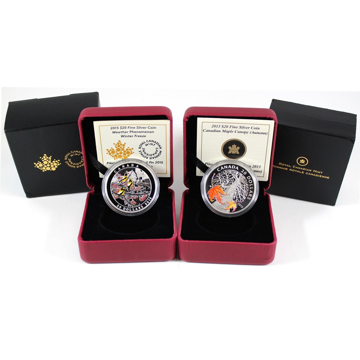 2013 $20 Canadian Maple Canopy - Autumn Fine Silver (tattered outer sleeve) & 2015 $20 Winter Freeze Weather Phenomenon Fine Silver Coin (Tax Exempt). 2pcs