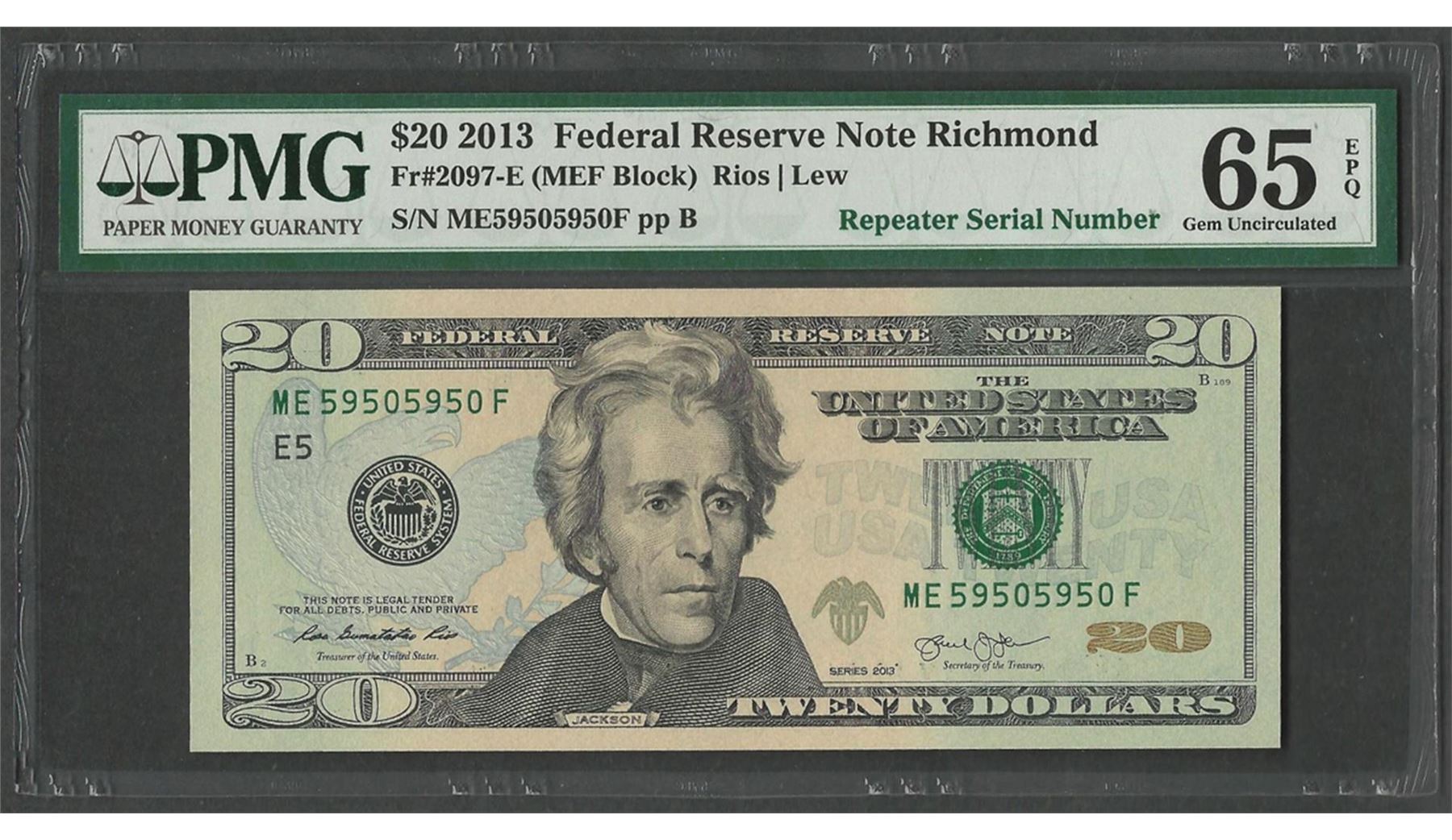 2013 $20 Federal Reserve Note Repeater Serial Number PMG Gem Uncirculated 65EPQ