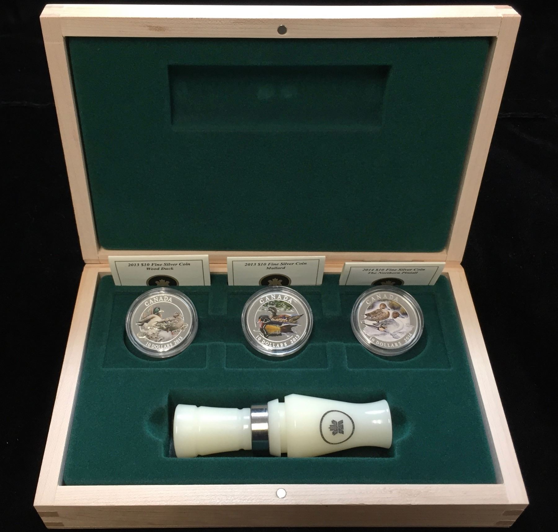 Lot 343; Fine Silver .9999 2013-2014 $10 Ducks of Canada 3-Coin Deluxe Box Set with Duck Caller, Proof, Colour, RCM Packing (Outer Box Unavailable)