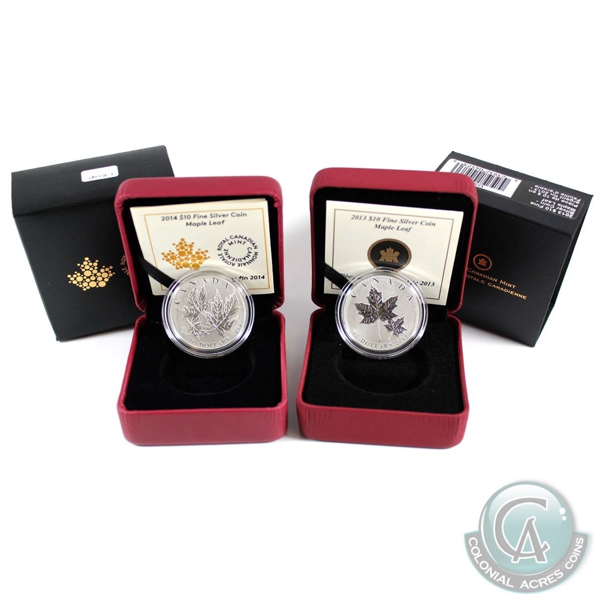 2013 & 2014 Canada $10 Maple Leaf Fine Silver Coins (Tax Exempt) 2pcs