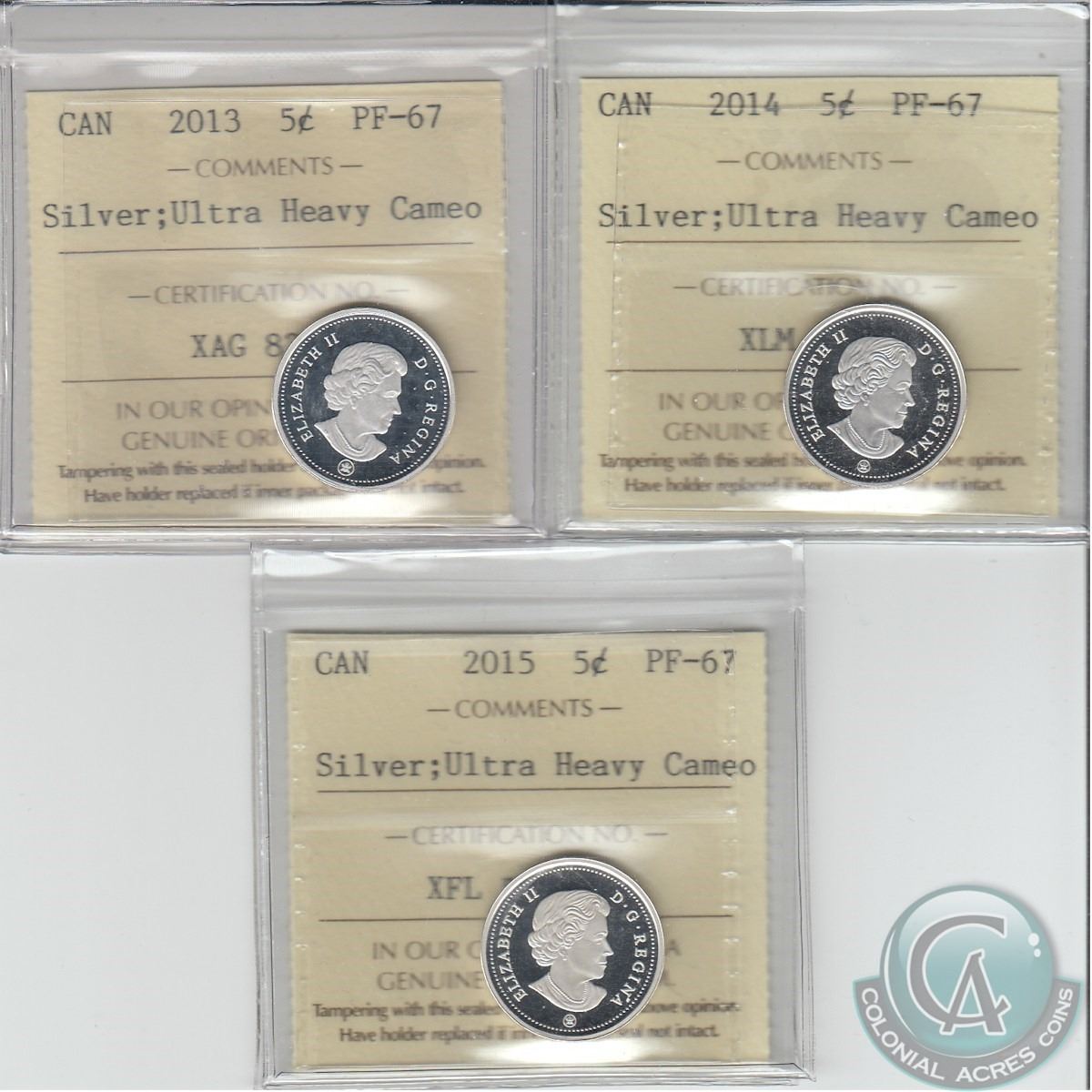 2013, 2014, and 2015 Canada Silver 5-cents All ICCS Certified PF-67; Ultra Heavy Cameo (3pcs)