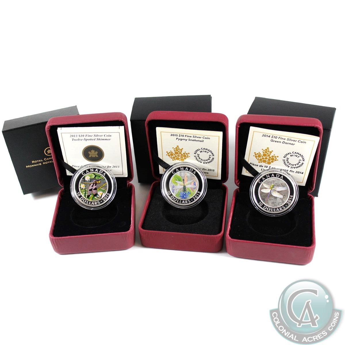 2013-2015 Canada $10 Dragonfly Fine Silver Coin Collection (Tax Exempt). You will receive the 2013 Twelve-spotted Skimmer, 2014 Green Darner, and 2015 Pygmy Snaketail. 3pcs.