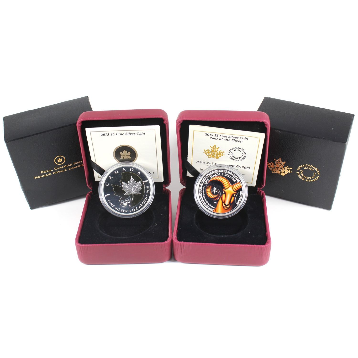 2013 & 2015 Canada $5 Commemorative Fine Silver Coin Set (TAX Exempt). You will receive the 2013 25th Anniversary of the SML with Gold Plating (dented outer box), and 2015 Year of the Sheep. 2pcs.