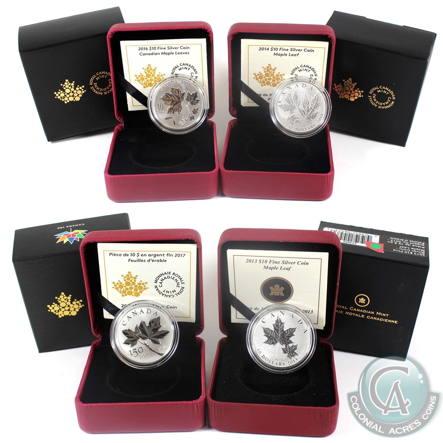 2013-2017 Canada $10 Fine Silver Maple Leaf Coins - 2013 Maple Leaf, 2014 Maple Leaf, 2016 Canadian Maple Leaves & 2017 Maple Leaves (2013 sleeve bent & 2014 sleeve has a surface tear). 4pcs (TAX Exempt)