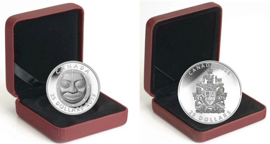 2013 $25 Grandmother Moon Mask & 2016 $25 The Coat of Arms of Canada - Pure Silver Coin. Lot of 2 pcs. Tax Exempt.