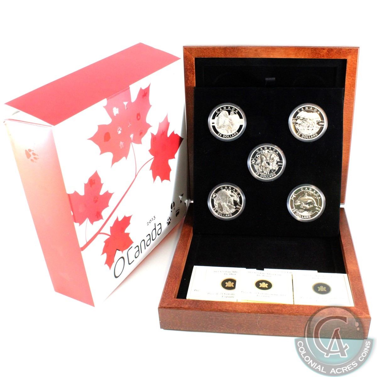 2013 $25 'O' Canada 5-coin Fine Silver Set (Tax Exempt). The coins included in this set are: The Orca, Caribou, Beaver, Wolf and the Polar Bear. Coins come encapsulated in a Deluxe Wooden Display Box with Outer Sleeve and COAs.