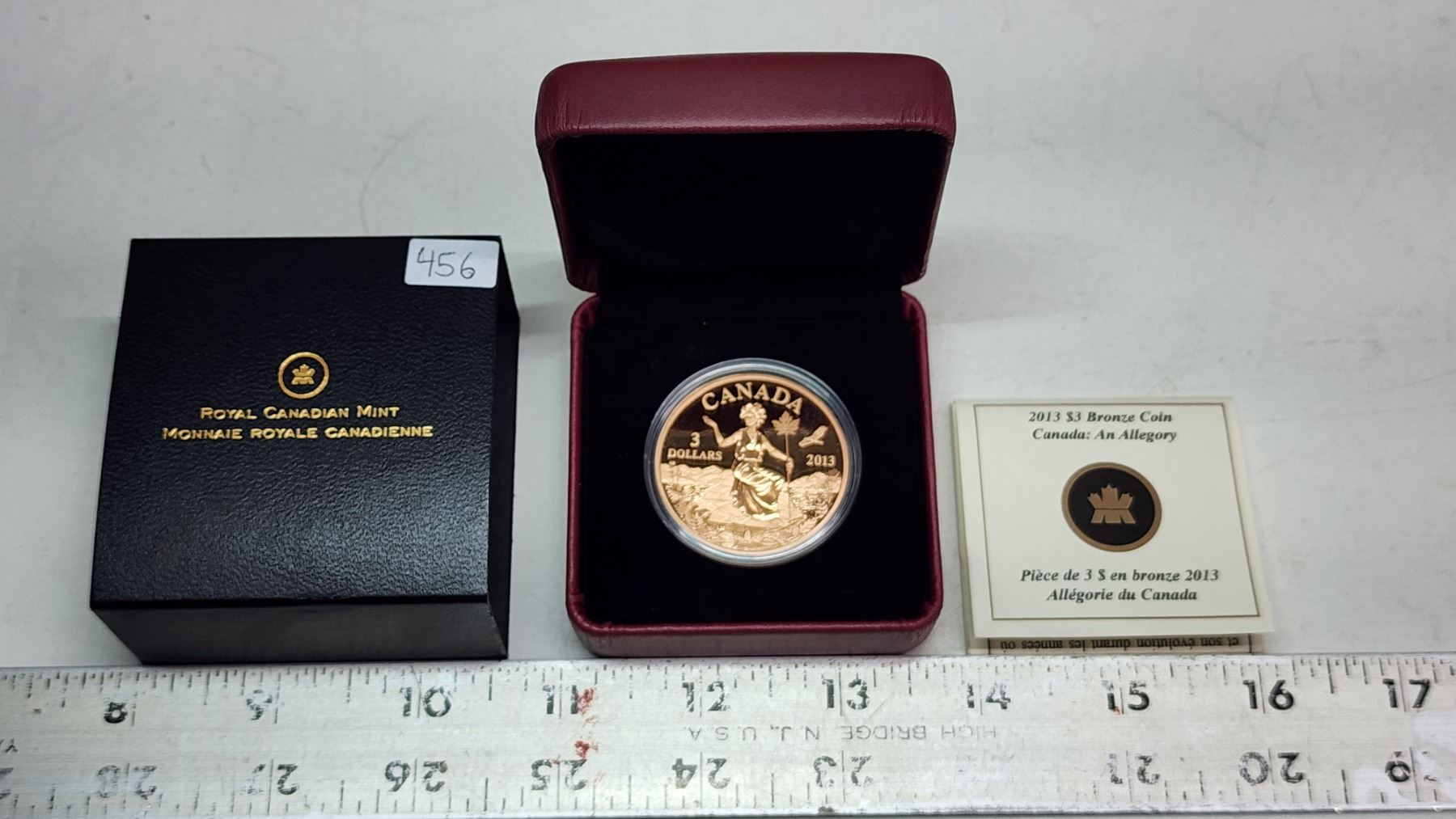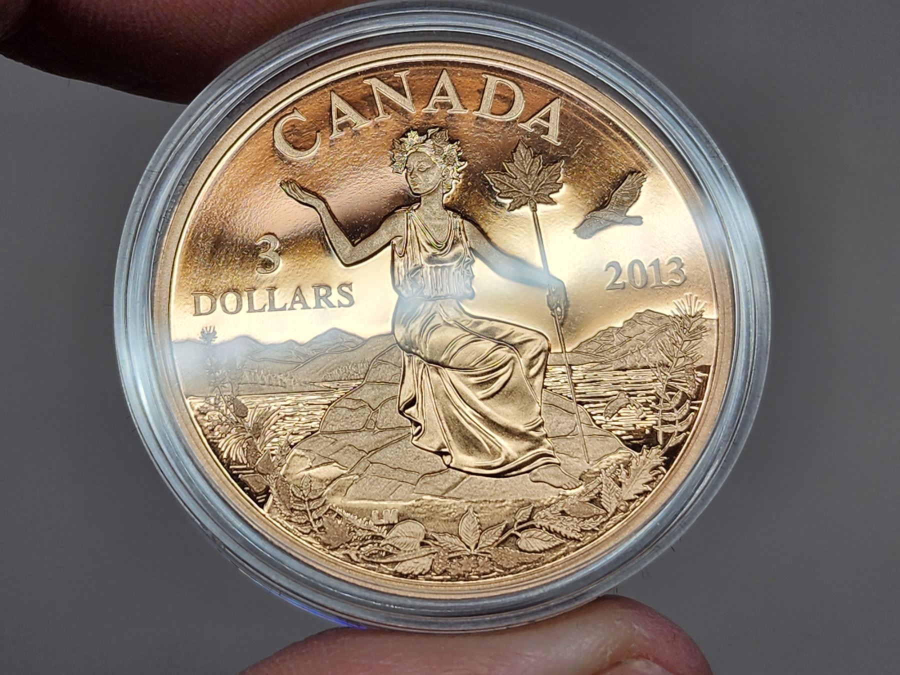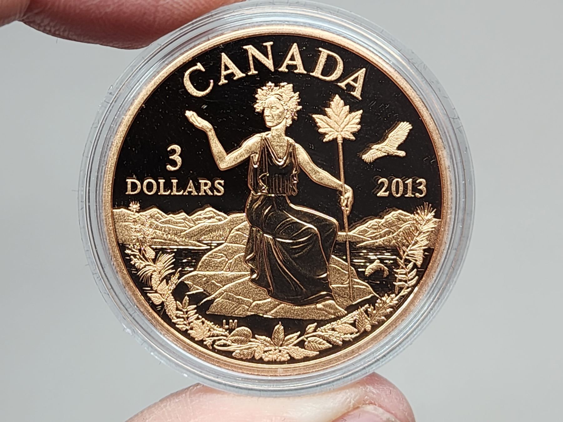 2013 $3 Canada: An Allegory. Bronze Lady of the North Land. Proof. Housed in its original RCM case & box of issue.