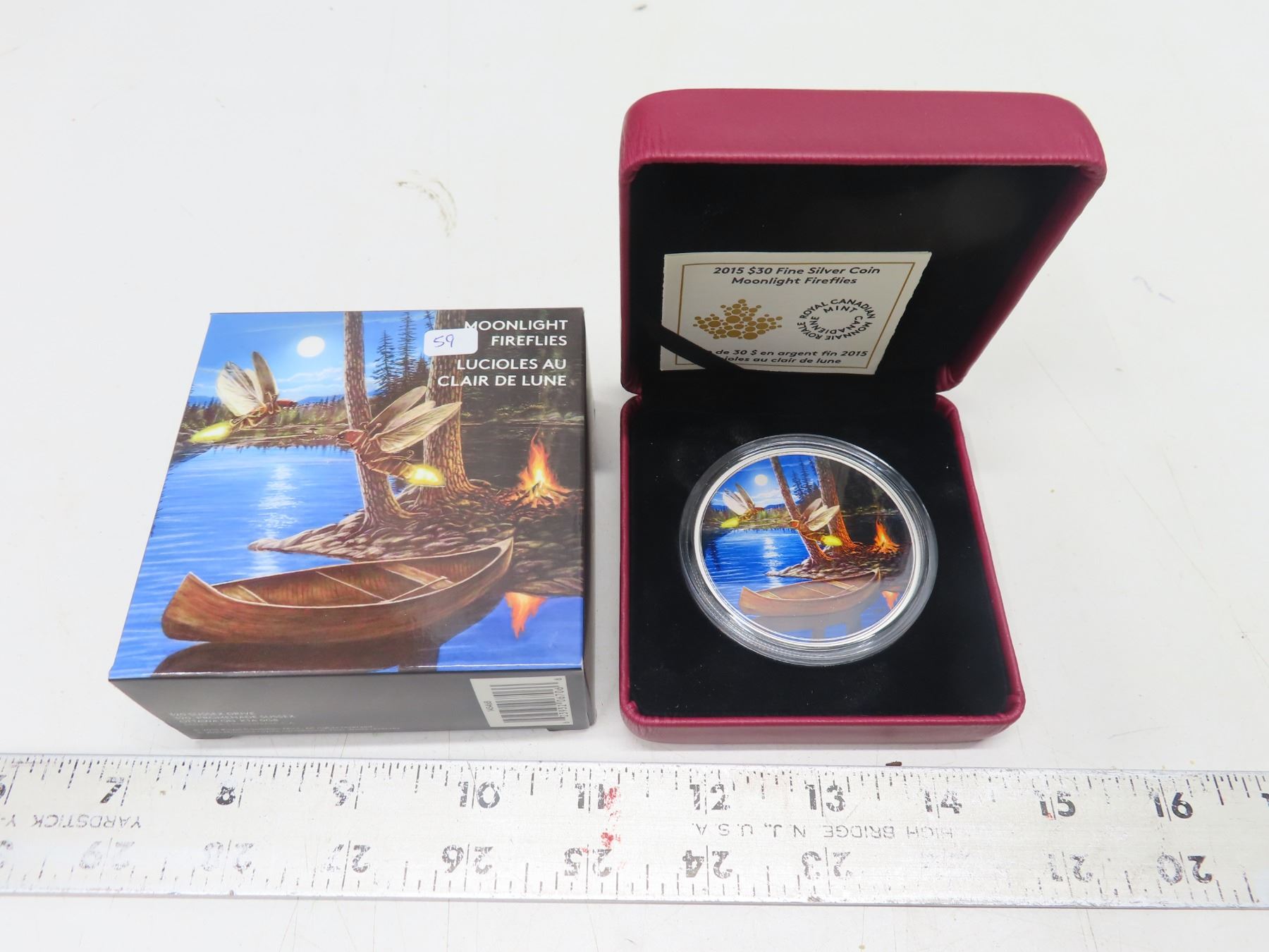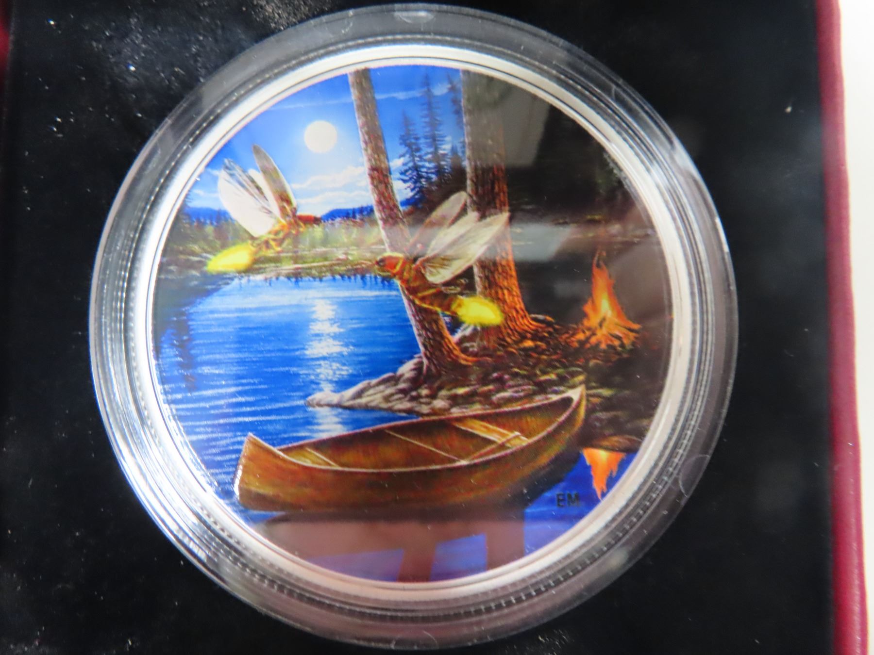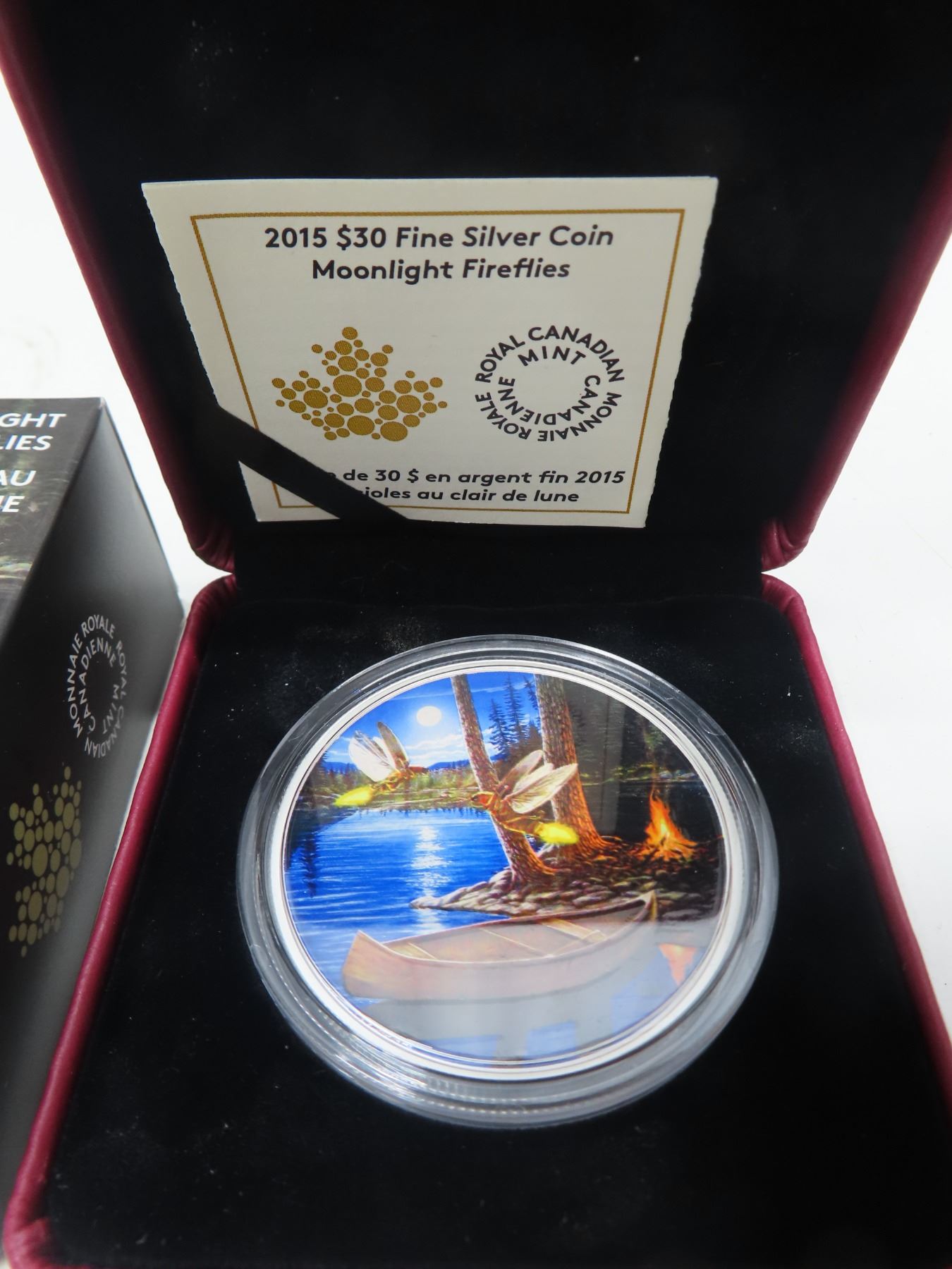 2013 $30 Moonlight Fireflies. Colourized. Proof with Ultra Heavy Cameo. One of only 3,999 issued. 99.99% pure Silver. Housed in its original Royal Canadian Mint case & box of issue plus Certificate of Authenticity.