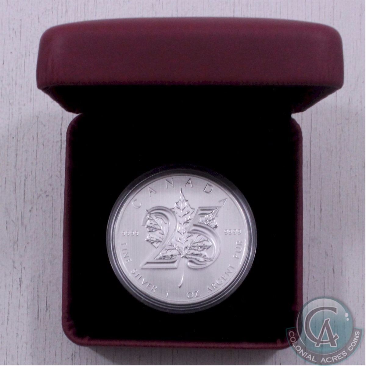 2013 $5 Canada 25th Anniversary of the Canadian Silver Maple Leaf 1oz .9999 Fine Silver (TAX Exempt). Coin comes encapsulated in a red display case.