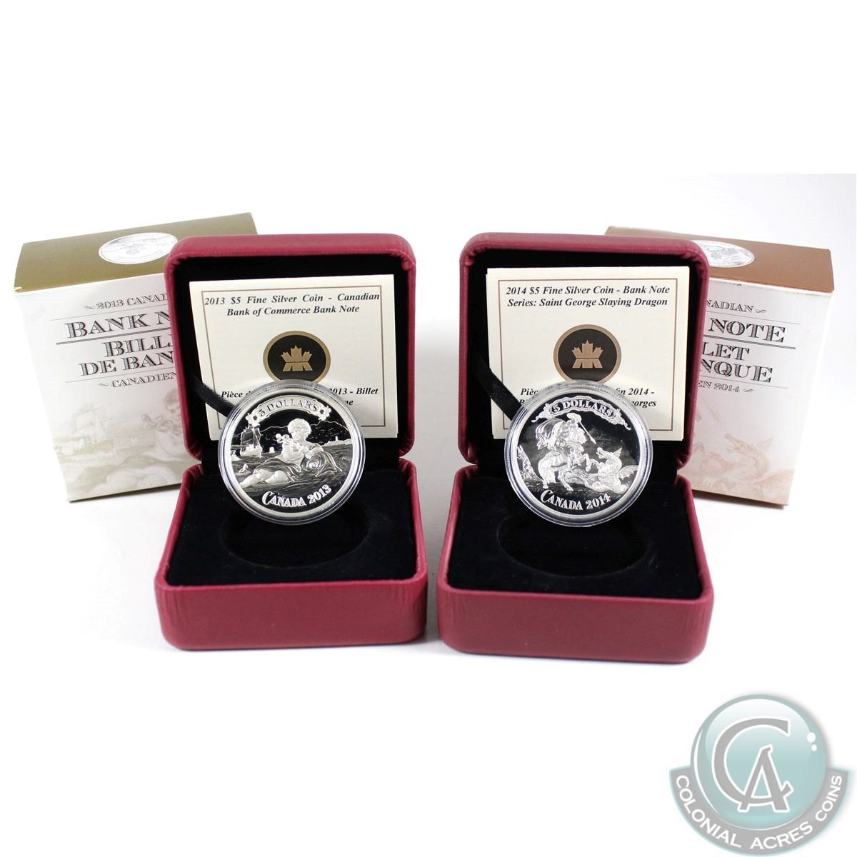 2013 $5 Canadian Bank of Commerce Bank Note Design & 2014 $5 Canadian Bank Notes: Saint George Slaying the Dragon (outer sleeve is tattered & capsule scratched) Fine Silver Coins. 2pcs (TAX Exempt)
