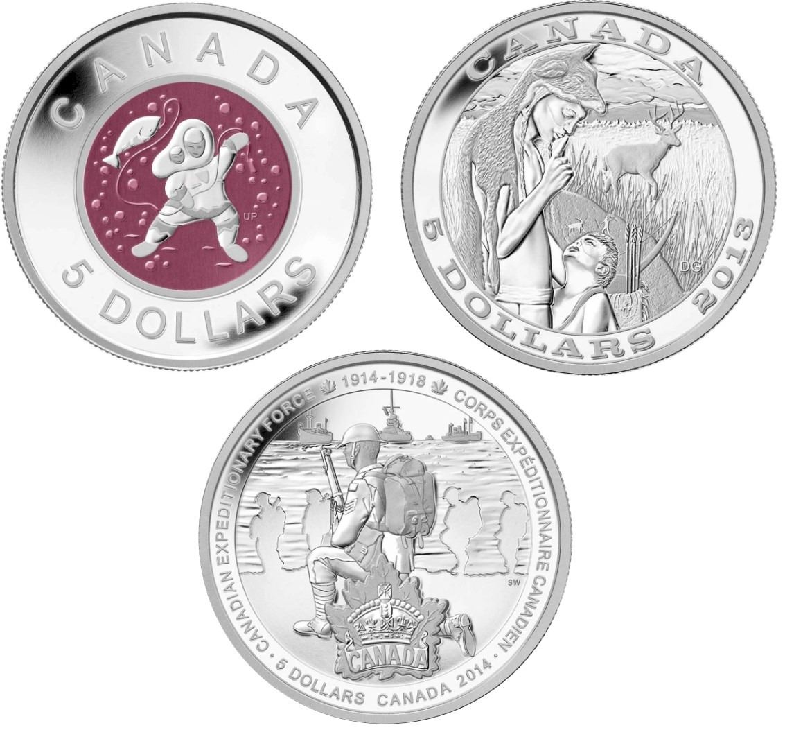 2013 $5 Contemporary Aboriginal Art: Mother and Baby Ice Fishing, $5 Tradition of Hunting: The Deer & 2014 $5 Canadian Expeditio