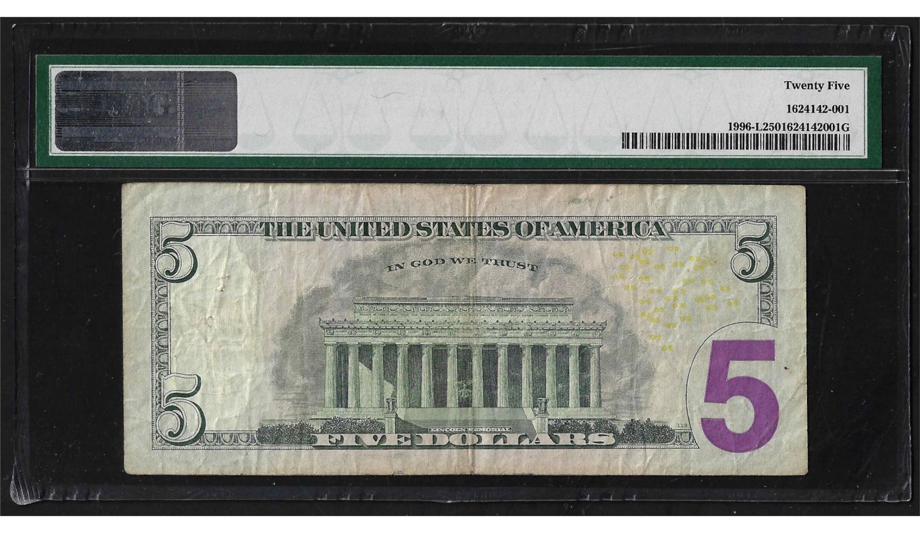 One 2013 $5 Federal Reserve Note Mismatched Serial Number Error Fr.1996-L PMG Very Fine 25. PMG Certified.