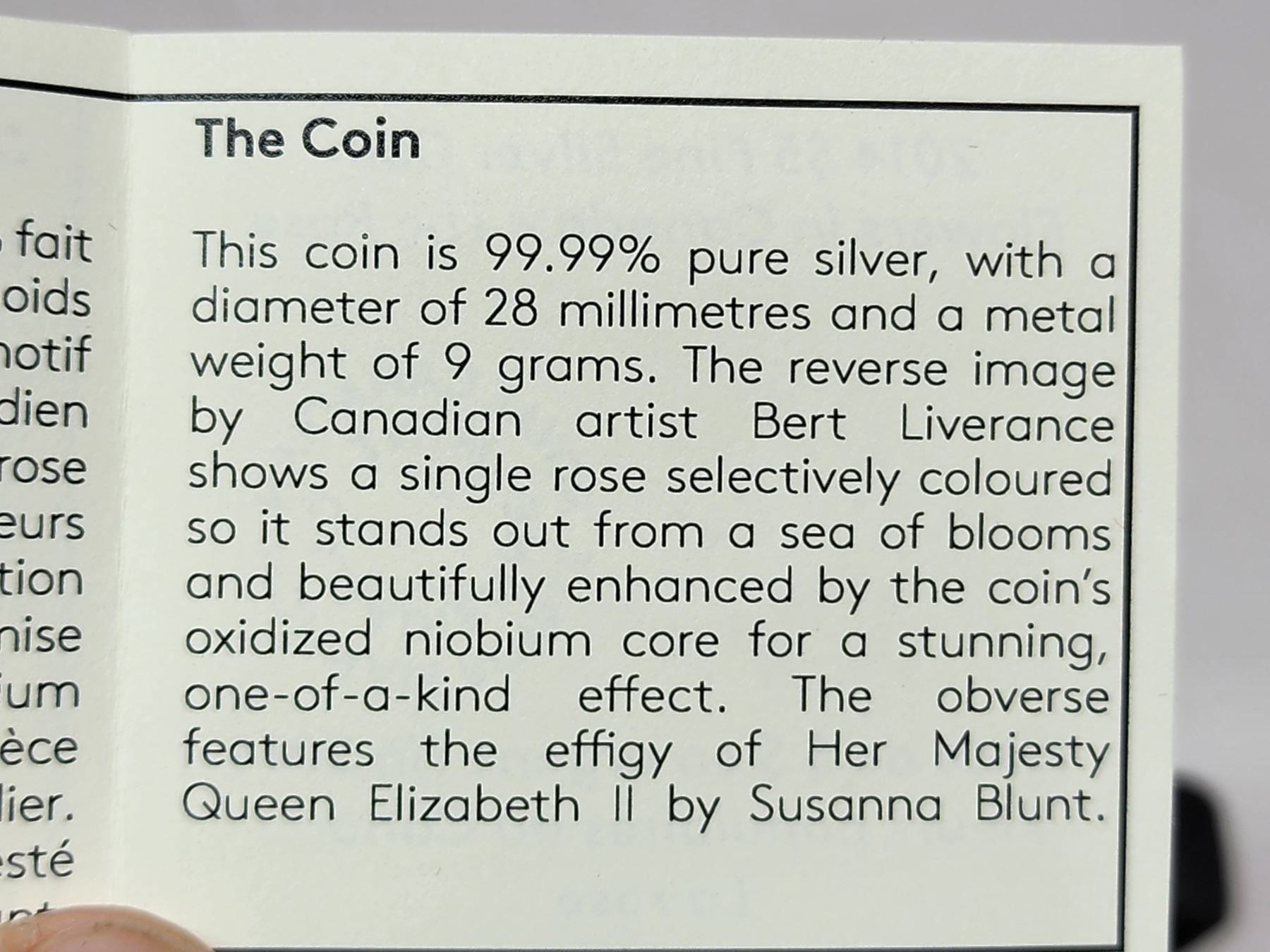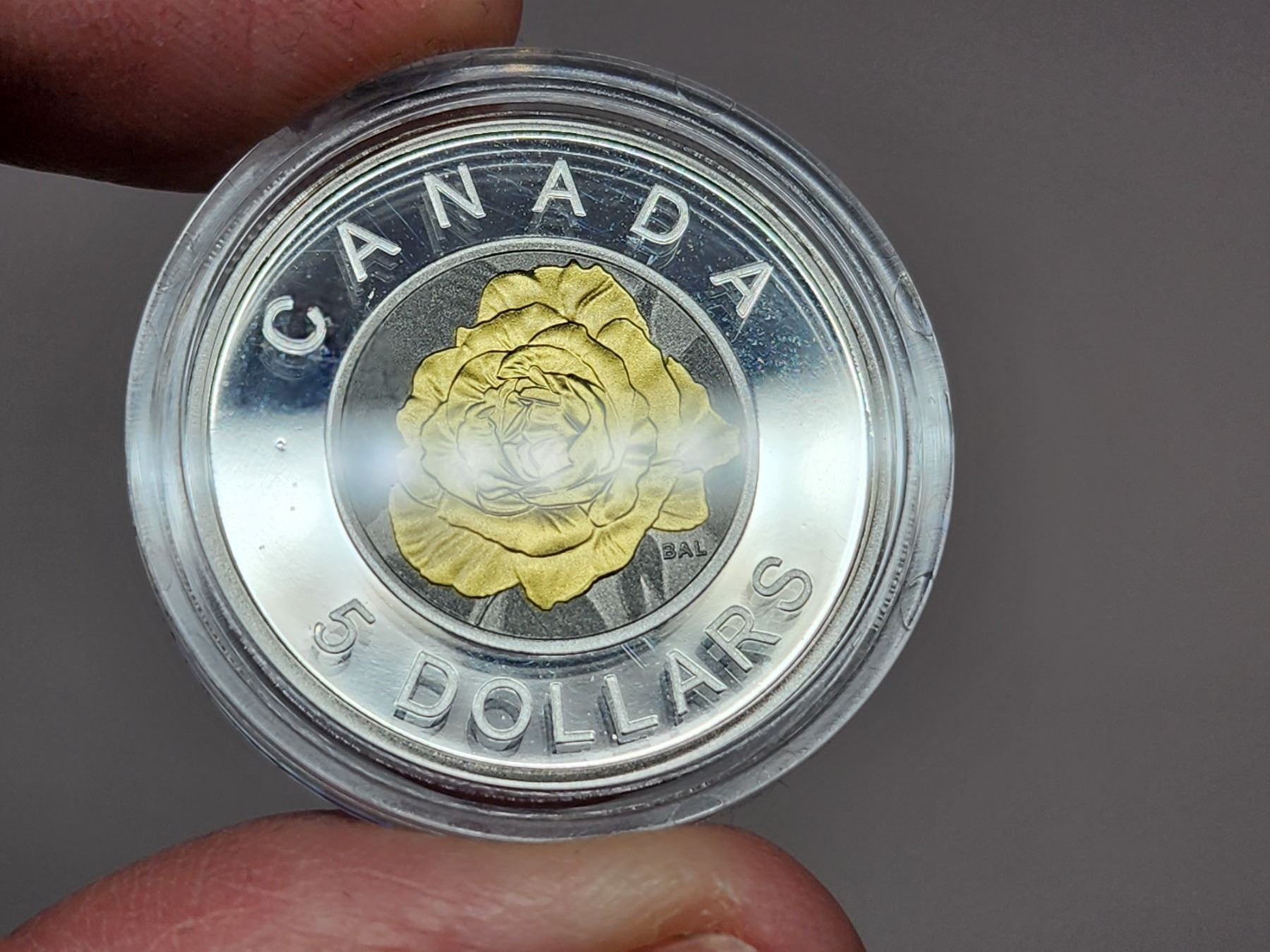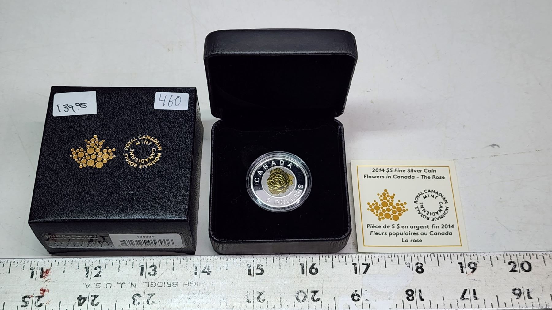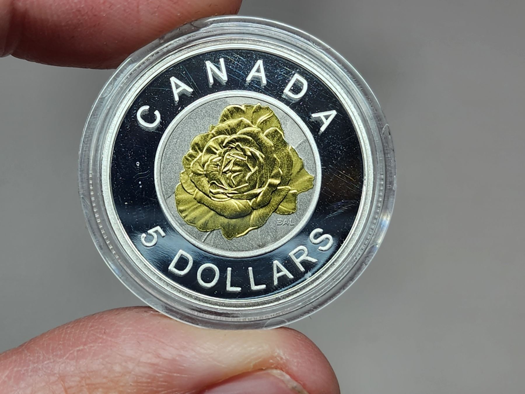 2013 $5 Flowers in Canada: Rose. 99.99% pure Silver. Coloured. Proof. Housed in its original RCM case & box of issue.