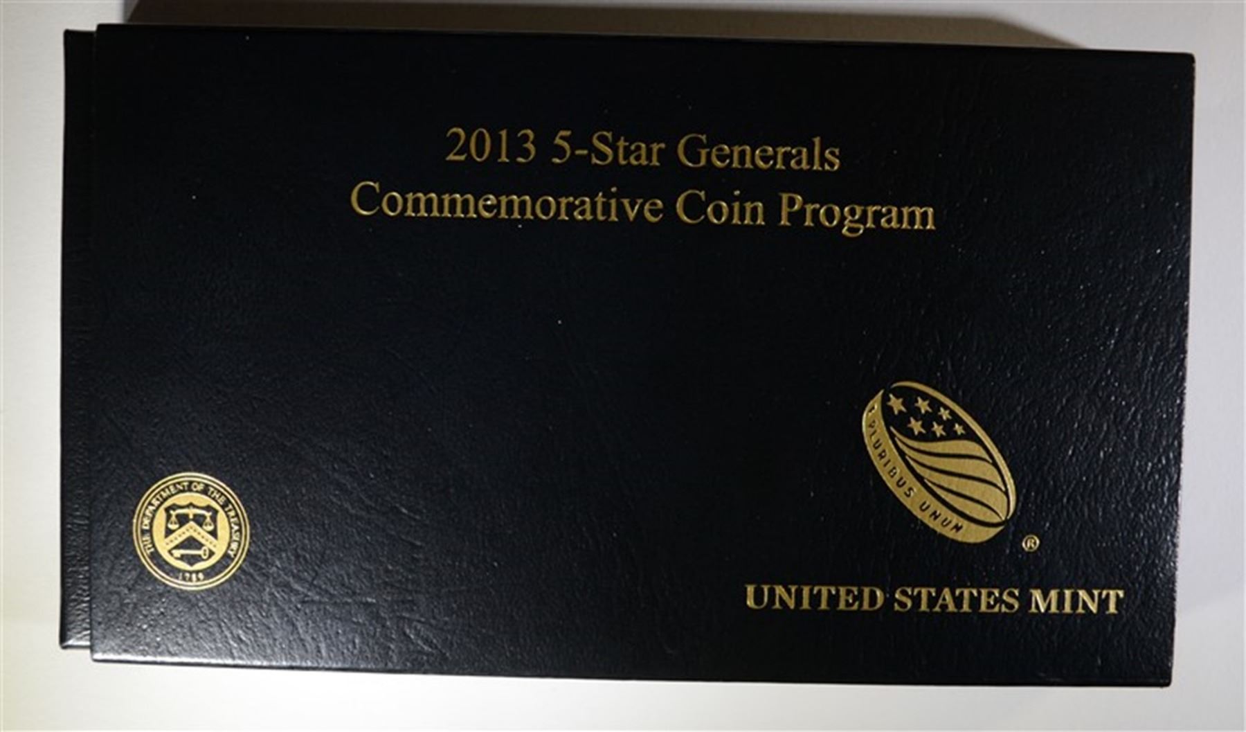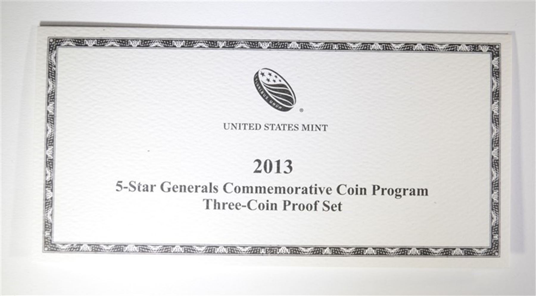 2013 5-Star General 3-Piece Commemorative - Includes Proof $5 Gold Coin, Proof Silver Dollar and Proof Clad Half Dollar in Original Packaging. ESTIMATE $475 - $500.