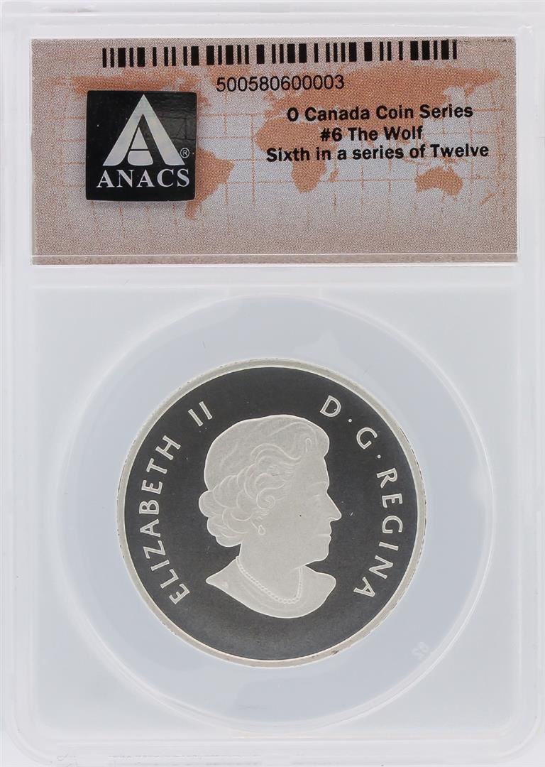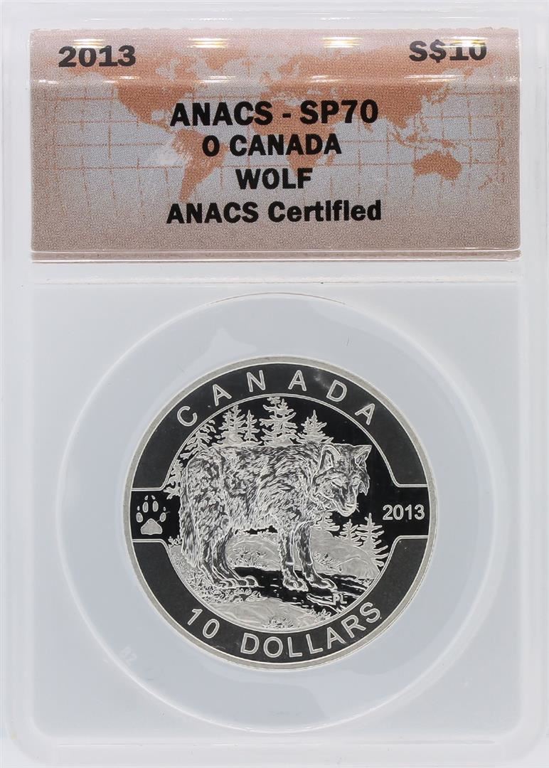 One 2013 ANACS Graded SP70 O Canada Wolf $10 Fine Silver Coin. ANACS Appraised.