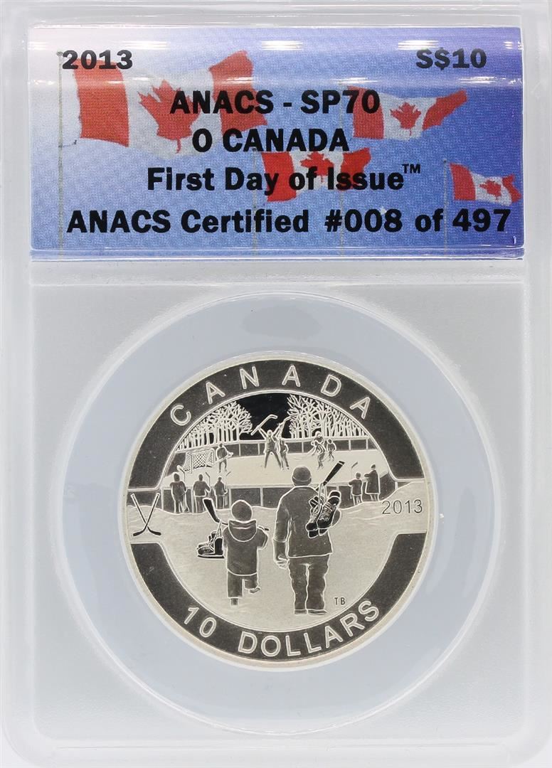 2013 ANACS SP70 $10 O Canada Hockey First Day of Issue Silver Coin (9th in a series of 12). ANACS Appraised.